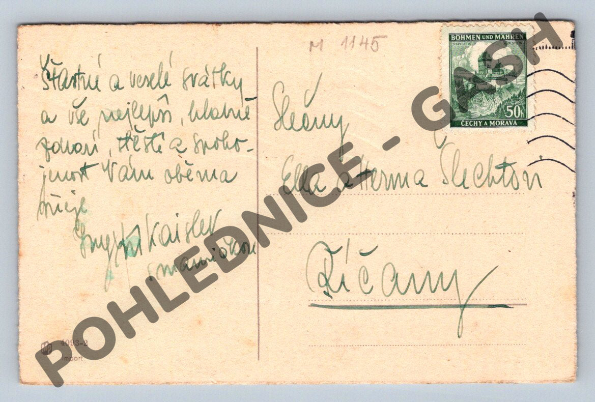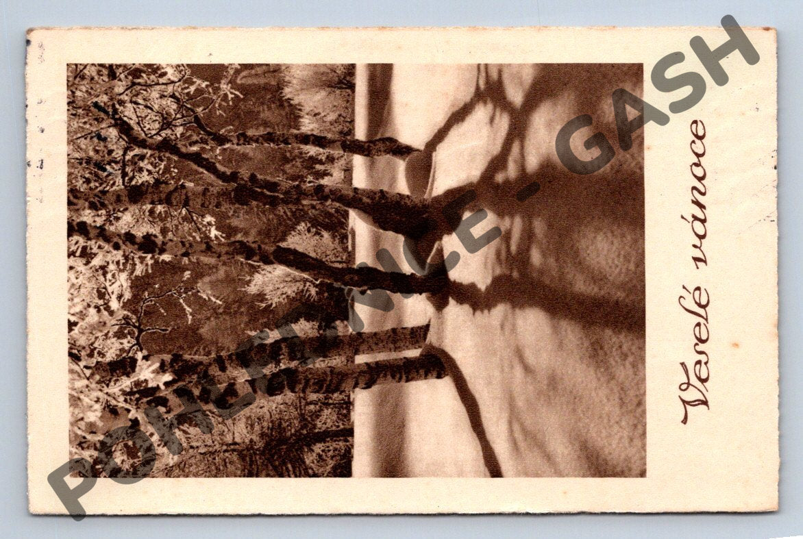 Starší česká pohlednice s vánočním motivem, s nápisem Veselé vánoce . Na čelní straně je černobílá zimní krajina se stromy. Pohlednice byla odeslána a je popsána, s razítkem a známkou Böhmen und Mähren , nominální hodnota 50h. Celkový stav odpovídá stáří – drobné známky opotřebení, rohy pohlednice jsou mírně ohnuté. Vhodné pro sběratele historických pohlednic i jako vánoční nostalgická dekorace.