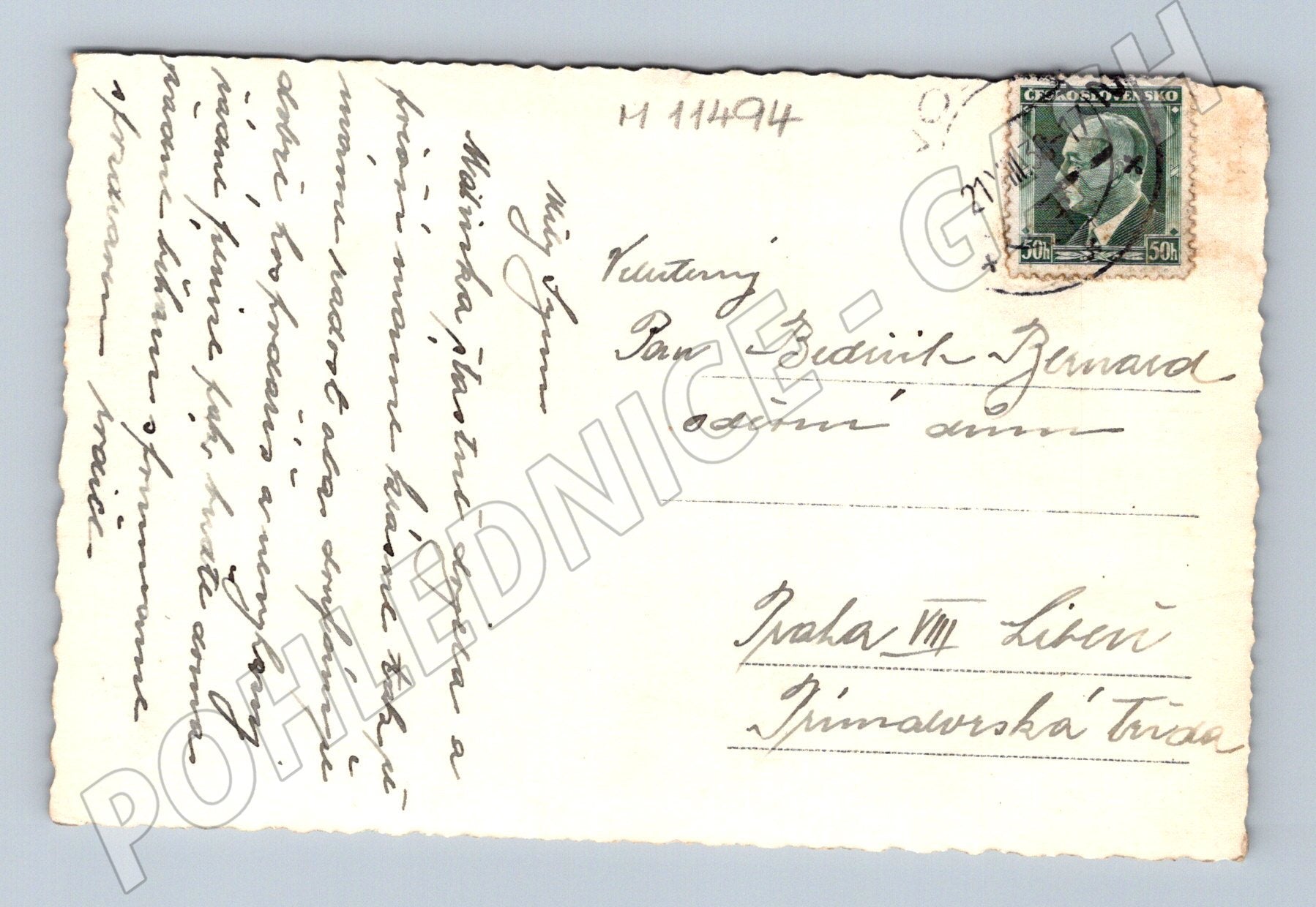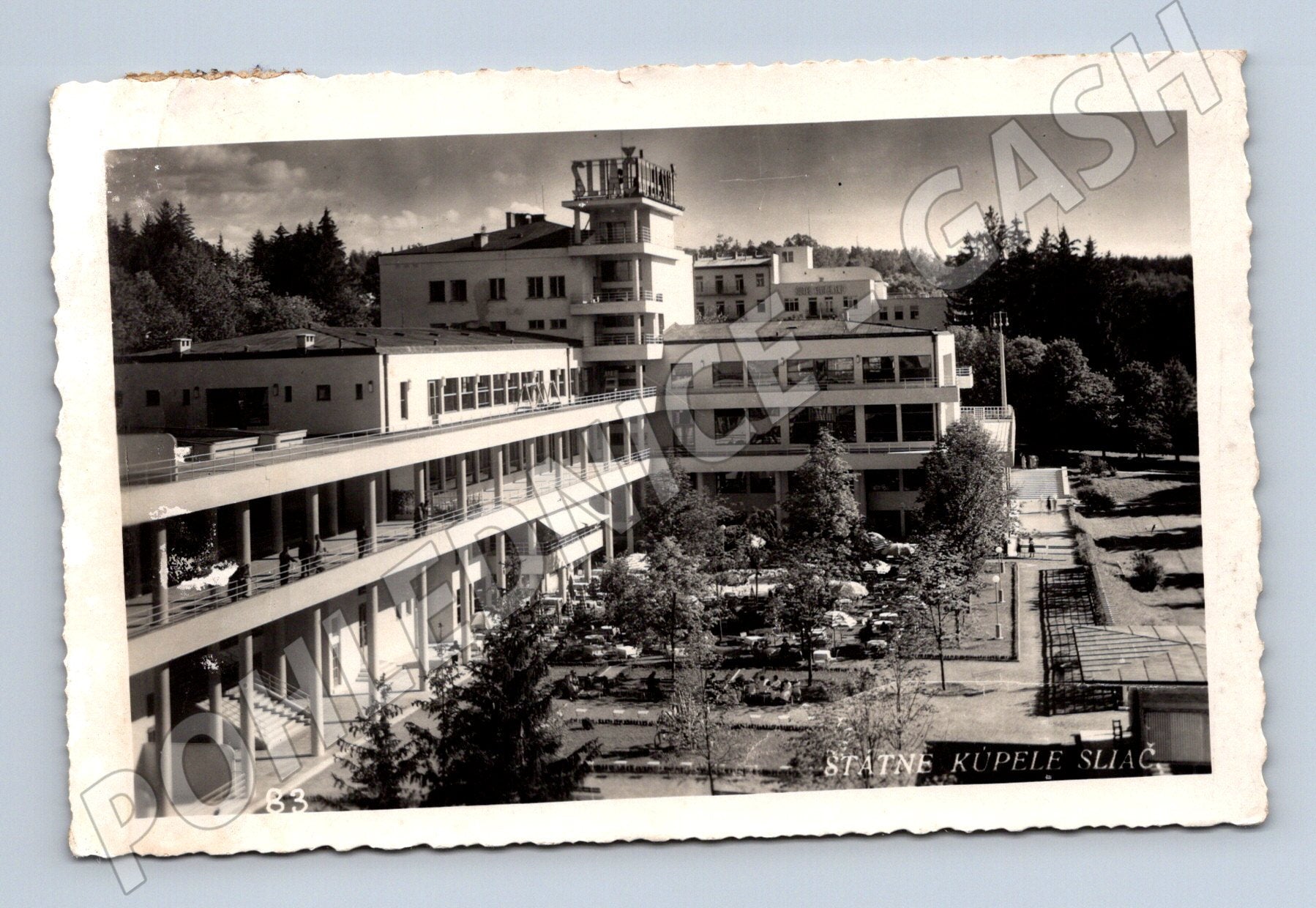 Originální černobílá pohlednice z období první poloviny 20. století, zachycující Státní lázně Sliač na Slovensku. Na přední straně je krásná fotografie modernistické lázeňské budovy obklopené parkem a zahradami, v pozadí les. Pohlednice byla zaslána poštou, a na zadní straně je rukou psaný text, adresa příjemce v Praze a známka s razítkem. Celkově je pohlednice v pěkném sběratelském stavu, s drobnými známkami stáří na okrajích. Skvělý přírůstek do sbírky historických slovenských pohlednic, dokumentující architekturu a atmosféru lázeňských měst před rokem 1950.