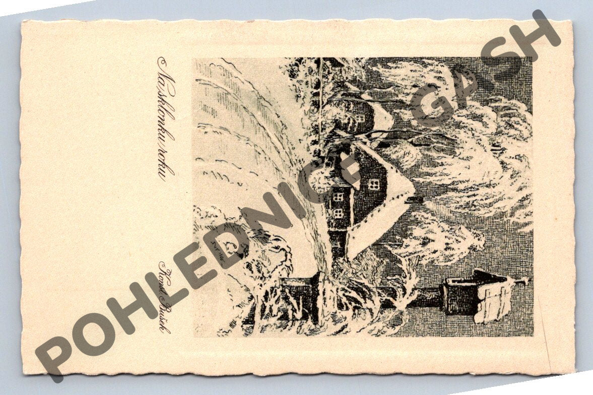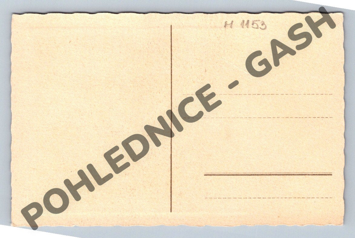 Originální pohlednice malého formátu s motivem zimní krajiny, chalup a věže. Hlavní ilustrace nese typický styl černobílého tisku, na přední straně je věnování Našl konku roku a podpis Tomáš Reitsch. Okraje pohlednice jsou zvlněné, charakteristické pro starší kusy. Na zadní straně je typické rozdělení pro adresu a text, v horním rohu značení H 1153. Pohlednice je v dobrém sběratelském stavu, bez popisu a poškození. Ideální doplněk historické sbírky nebo jako dekorace s atmosférou starých časů Čech.