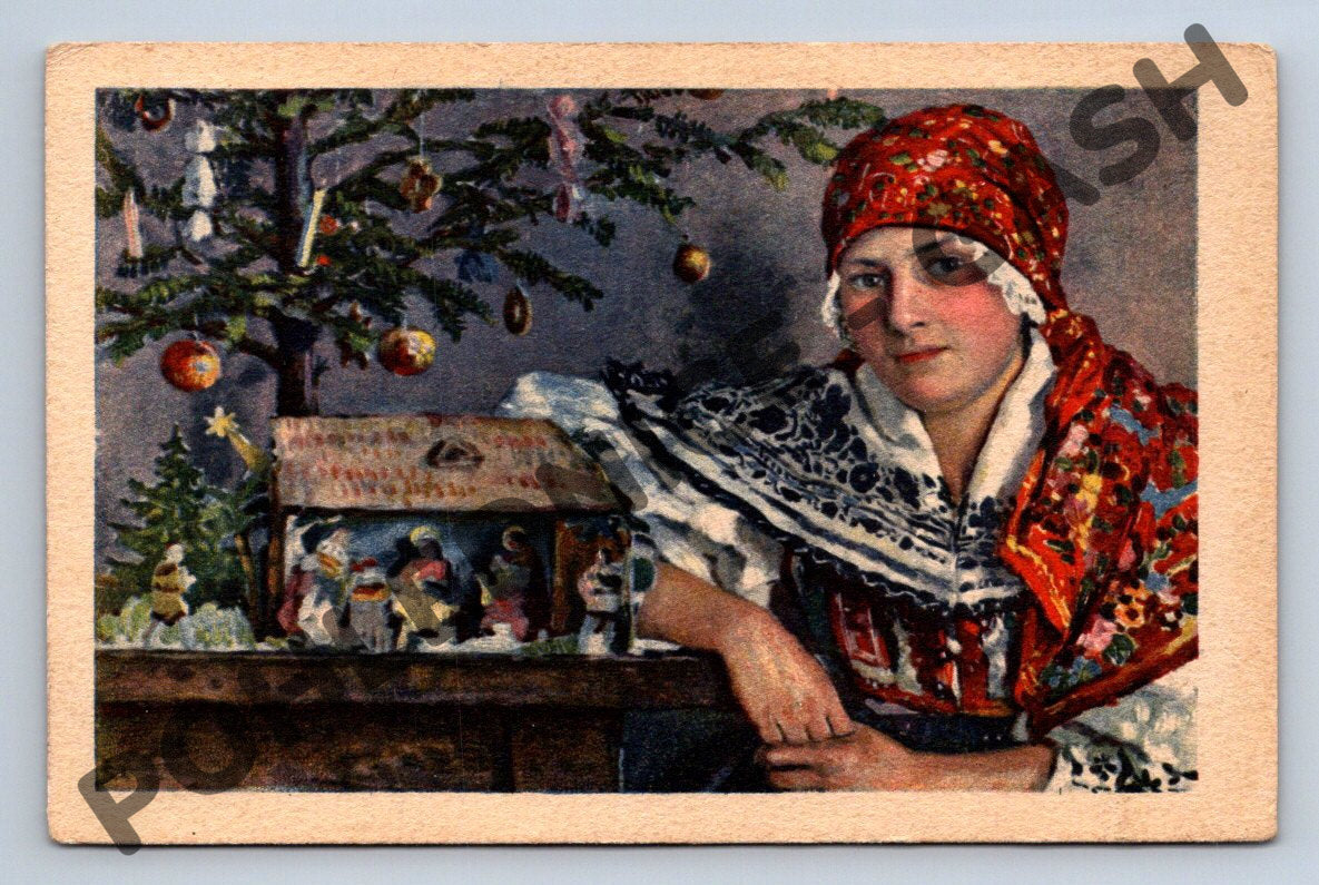 Nabízím originální vánoční pohlednici z období první poloviny 20. století (do roku 1950), ilustrovanou profesorem Františkem Šindelářem. Na lícové straně pohlednice je vyobrazena mladá žena v tradičním kroji, u betlému a ozdobeného vánočního stromku. Pohlednice je ručně psaná, prošlá poštou a opatřená známkou a razítkem. Na rubu je přání Šťastné Vánoce a rukopisný vzkaz. Pohlednice je v zachovalém sběratelském stavu, vhodná do sbírky historických pohlednic nebo jako sběratelský artefakt s vánoční tématikou a národopisným námětem. Rozměr malý formát, odpovídá období do roku 1950, původ ČSR.