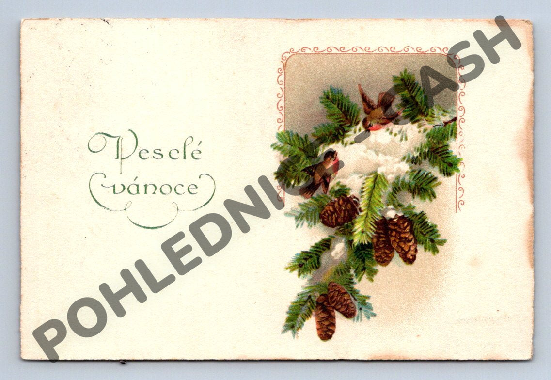 Starobylá vánoční pohlednice zaslaná z tehdejšího Československa, s originálním razítkem a známkou s portrétem prezidenta. Na přední straně dekorativní text Veselé Vánoce a krásný zimní motiv s větvičkami, šiškami a ptáčky. Pohlednice je ve velmi dobrém stavu vzhledem ke svému stáří, s drobnými stopami běžného opotřebení a patinou. Z druhé strany ručně psané blahopřání a adresát. Ideální sběratelský kousek pro milovníky historických vánočních pohlednic z českých zemí.