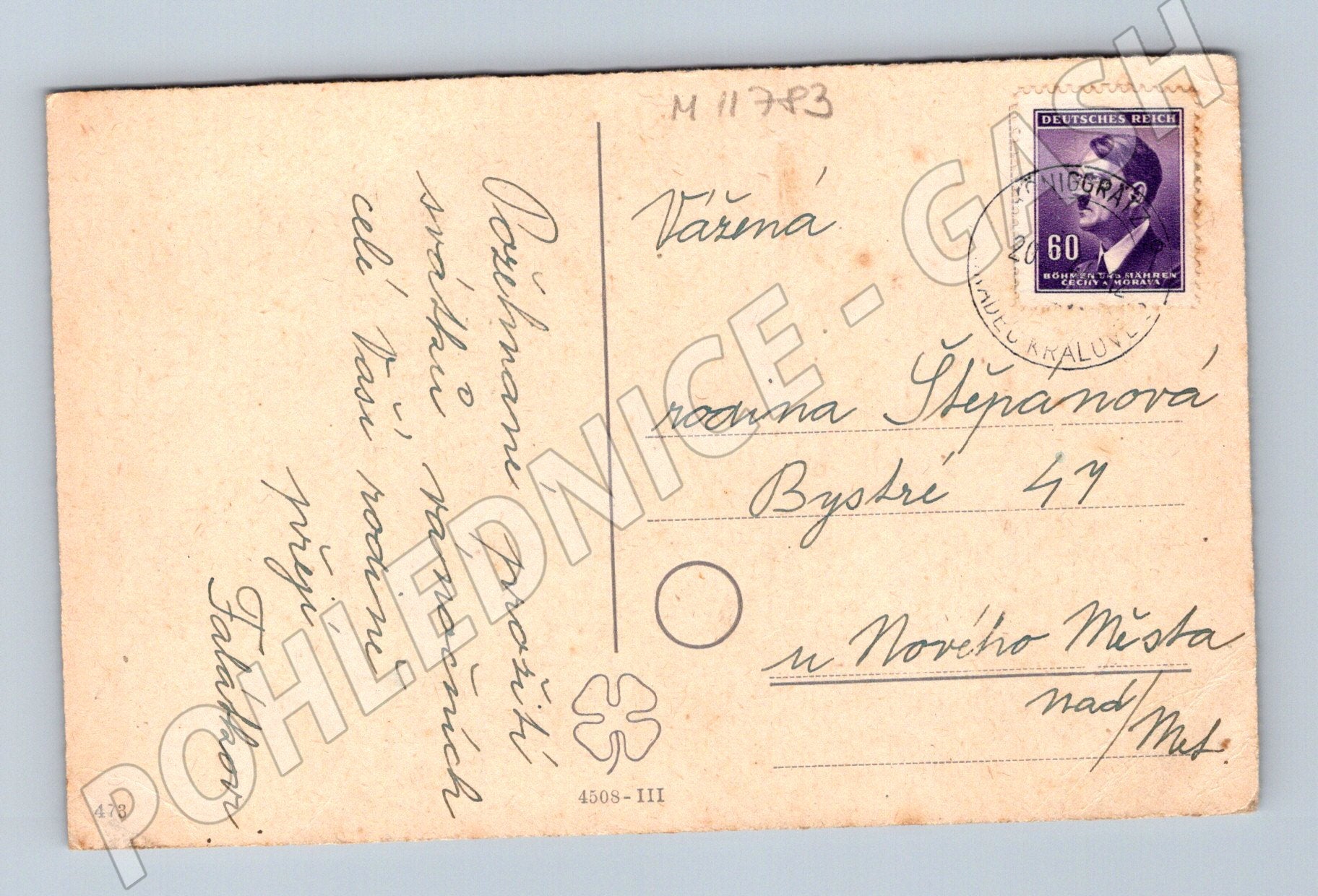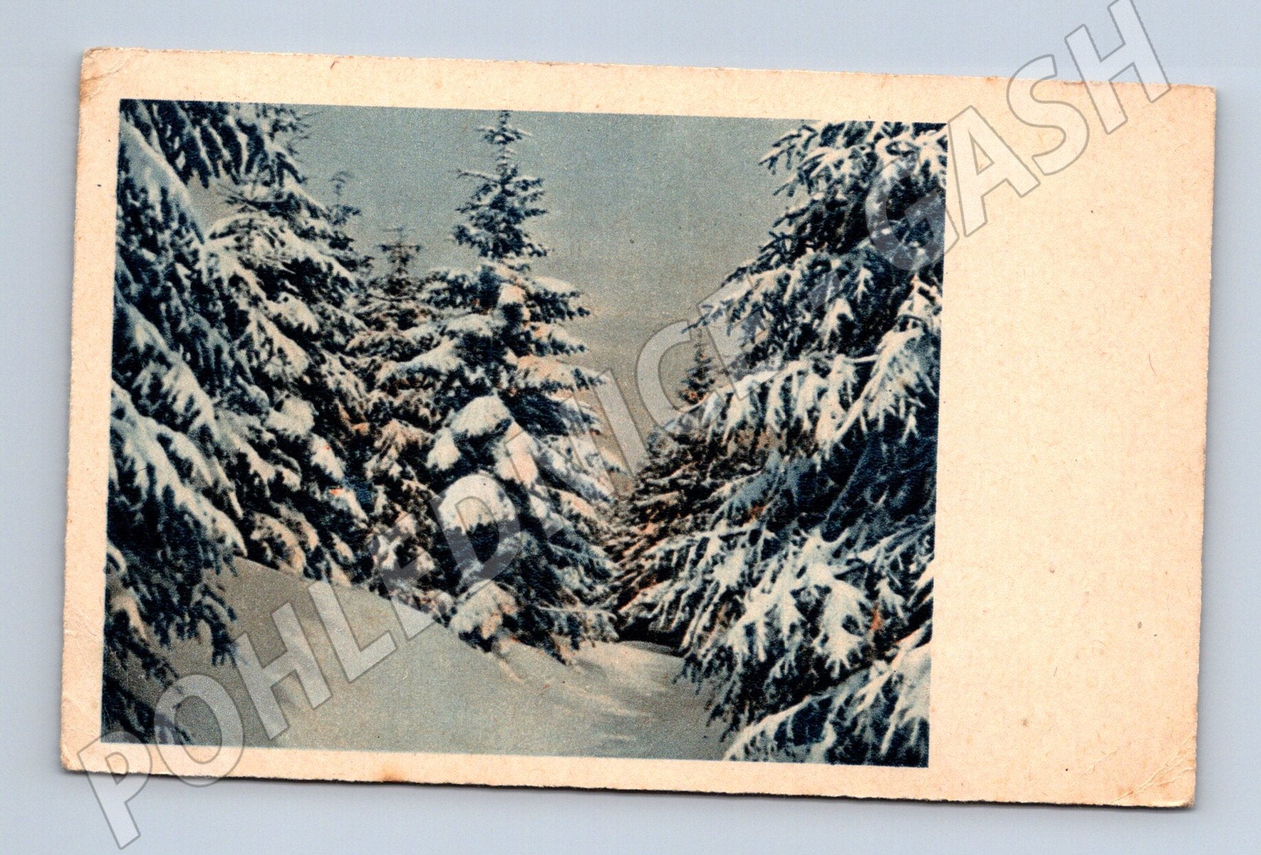 Originální stará zimní pohlednice z období druhé světové války, zaslaná poštou. Na přední straně je tištěná barevná fotografie zasněžených smrků v zimní krajině. Zadní stranu vyplňuje ručně psaný text, adresa a známka Německé říše s portrétem (60 Pfennig, Adolf Hitler), razítkovaná v roce 1943. Pohlednice je adresována paní Štěpanové do obce Bystří u Nového Města nad Metují. Pohlednice je v původním, sběratelském stavu, známky stáří a opotřebení odpovídají stáří předmětu. Rarita pro sběratele historické korespondence, válečných artefaktů či pohlednic z oblasti bývalého Protektorátu Čechy a Morava.