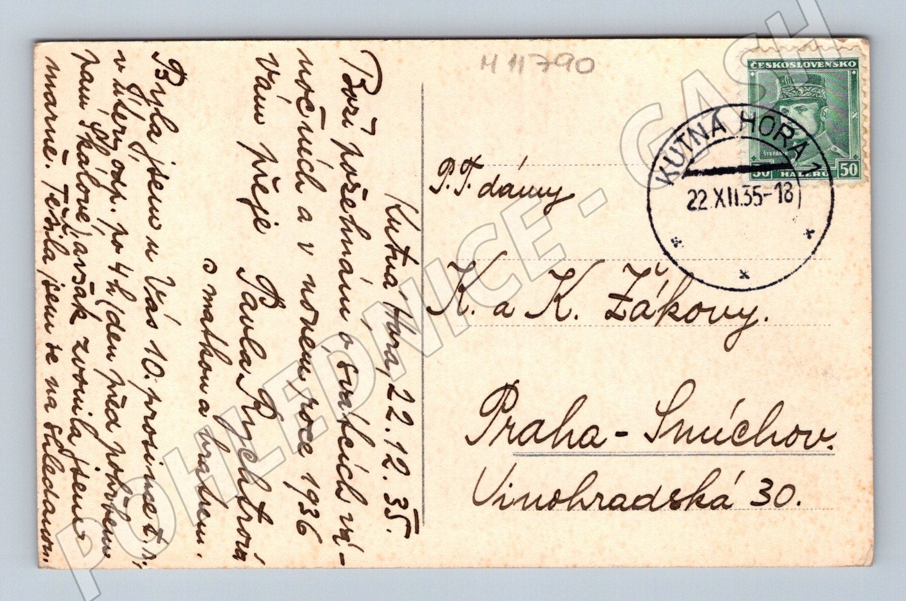 Vánoční pohlednice, Kutná Hora, 1935, malý formát ČSR