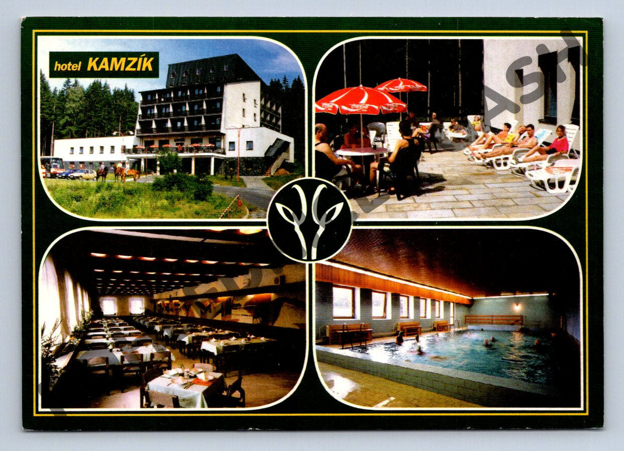 Nabízím originální pohlednici Horského hotelu Kamzík v Malé Morávce-Karlově, vydanou v 90. letech (rok 1995/96, vydavatel DAN, foto: Petr Novák). Na pohlednici najdete koláž čtyř fotografií – celkový pohled na hotel, venkovní posezení s hosty, interiér restaurace a krytý bazén. Zadní strana je prošlá poštou se známkou ČR a datem odeslání 1996. Ručně psaný vzkaz adresovaný do Rakovníka. Skvělý stav, drobné stopy stáří, krásný sběratelský kousek pro milovníky turistiky i historie českých rekreačních zařízení.