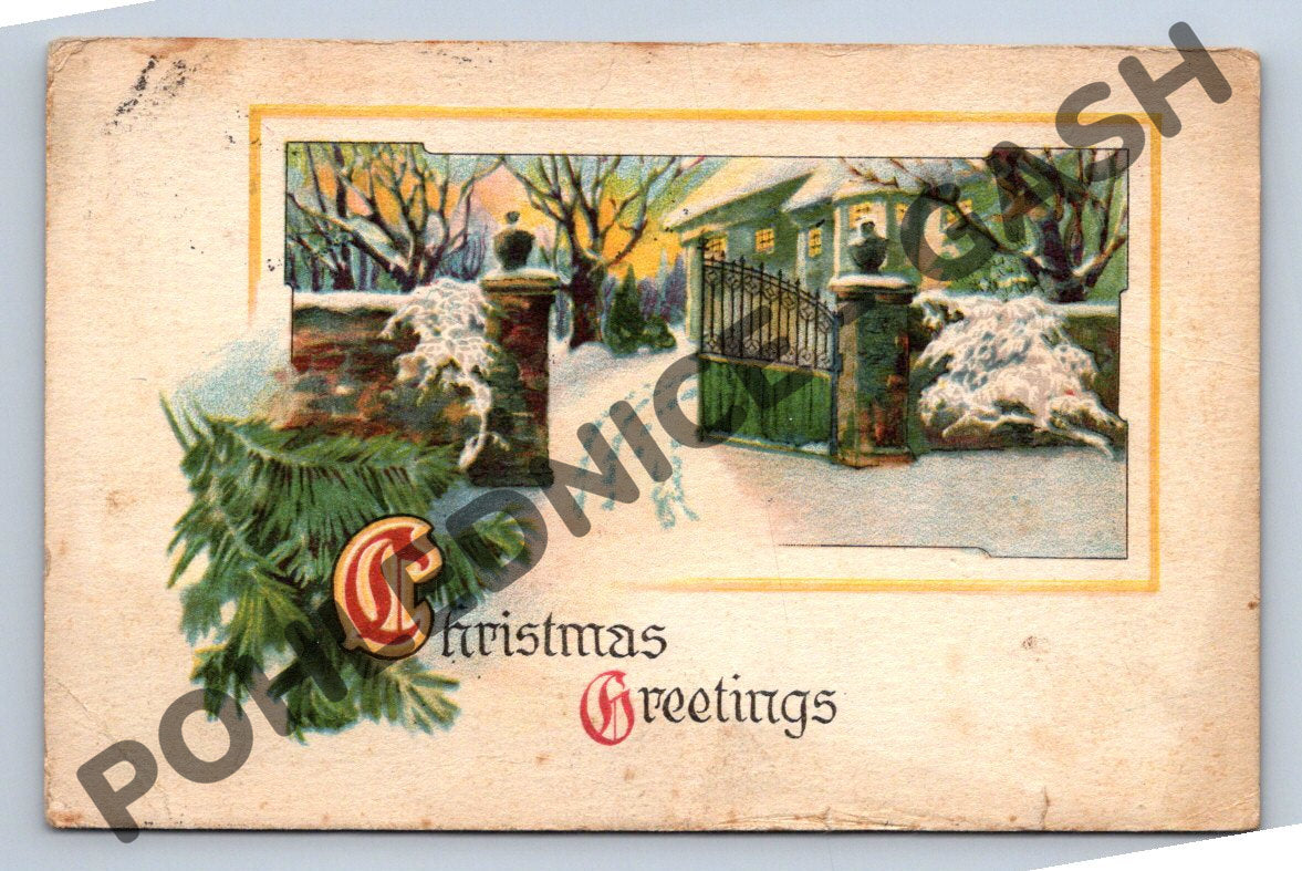 Starobylá vánoční pohlednice zaslaná z USA do Prahy, Československo, datovaná rokem 1920. Na přední straně je krásná zimní ilustrace domu se zasněženou bránou a větvemi, doplněná stylizovaným nápisem Christmas Greetings. Pohlednice je ručně psaná, opatřena autentickou známkou a vánočním přáním v češtině. Vhodné pro sběratele historických pohlednic i milovníky vánoční tematiky. Celkově dobrý stav, drobné opotřebení na okrajích, patina stáří.
