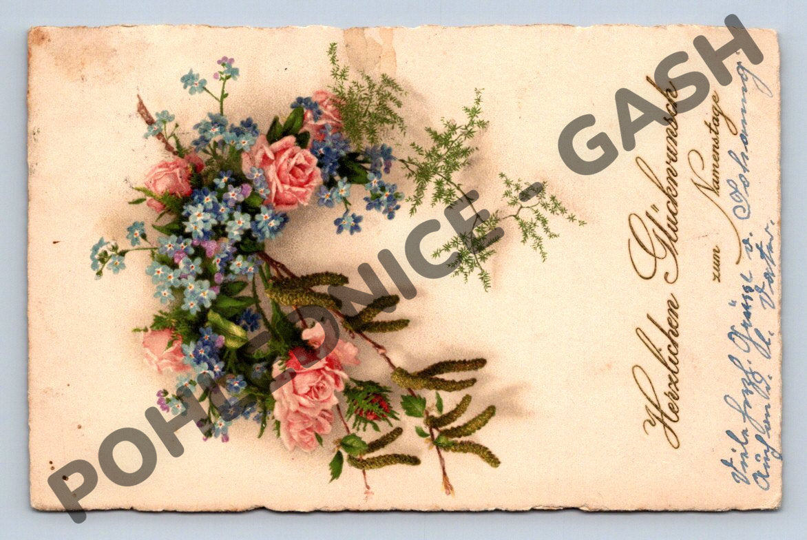 Originální pohlednice z Rakouska z roku 1922 s přáním k svátku. Na přední straně je krásná květinová ilustrace (růže a pomněnky) a německý nápis Herzlichen Glückwunsch zum Namenstage. Zadní strana je ručně popsána, opatřena třemi rakouskými známkami a jasně čitelným datem odeslání 22. července 1922 z Vídně do Mnichovic u Prahy. Pohlednice je ve velmi dobrém sběratelském stavu, pouze mírné známky stáří v rozích. Ideální k doplnění sbírky historických nebo tematicky květinových pohlednic z Rakouska a střední Evropy. Výjimečný doklad korespondence z první třetiny 20. století.