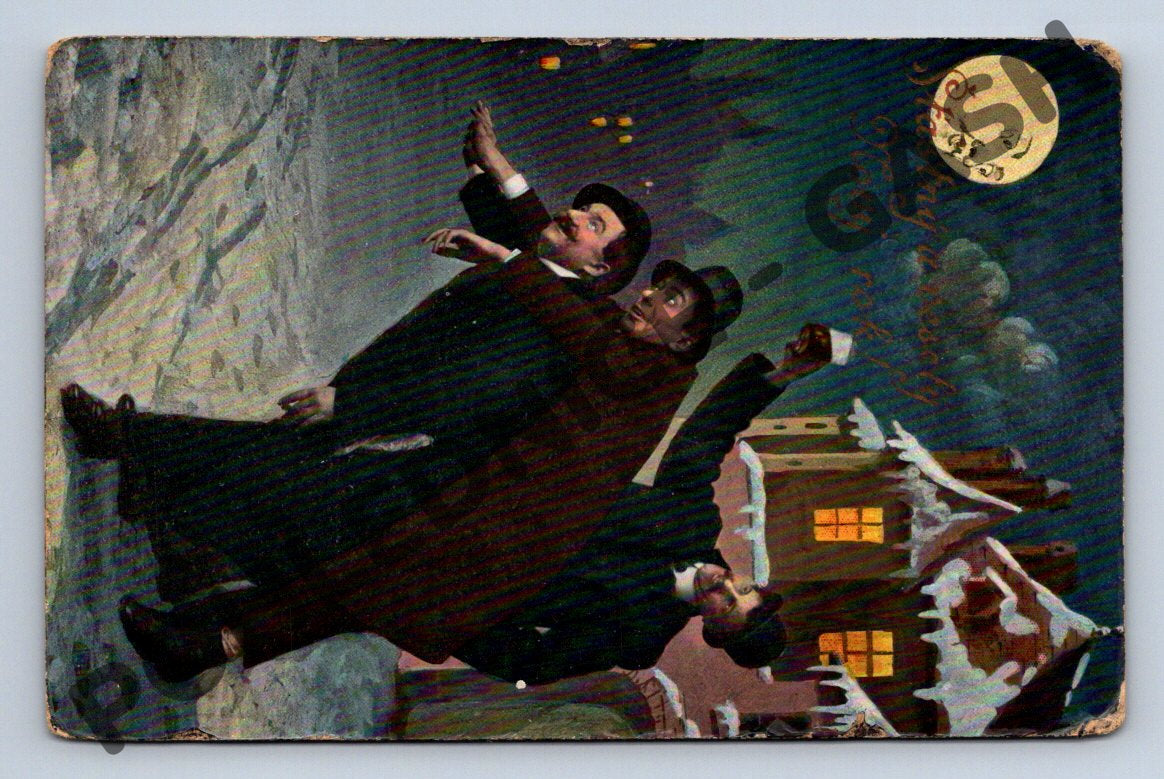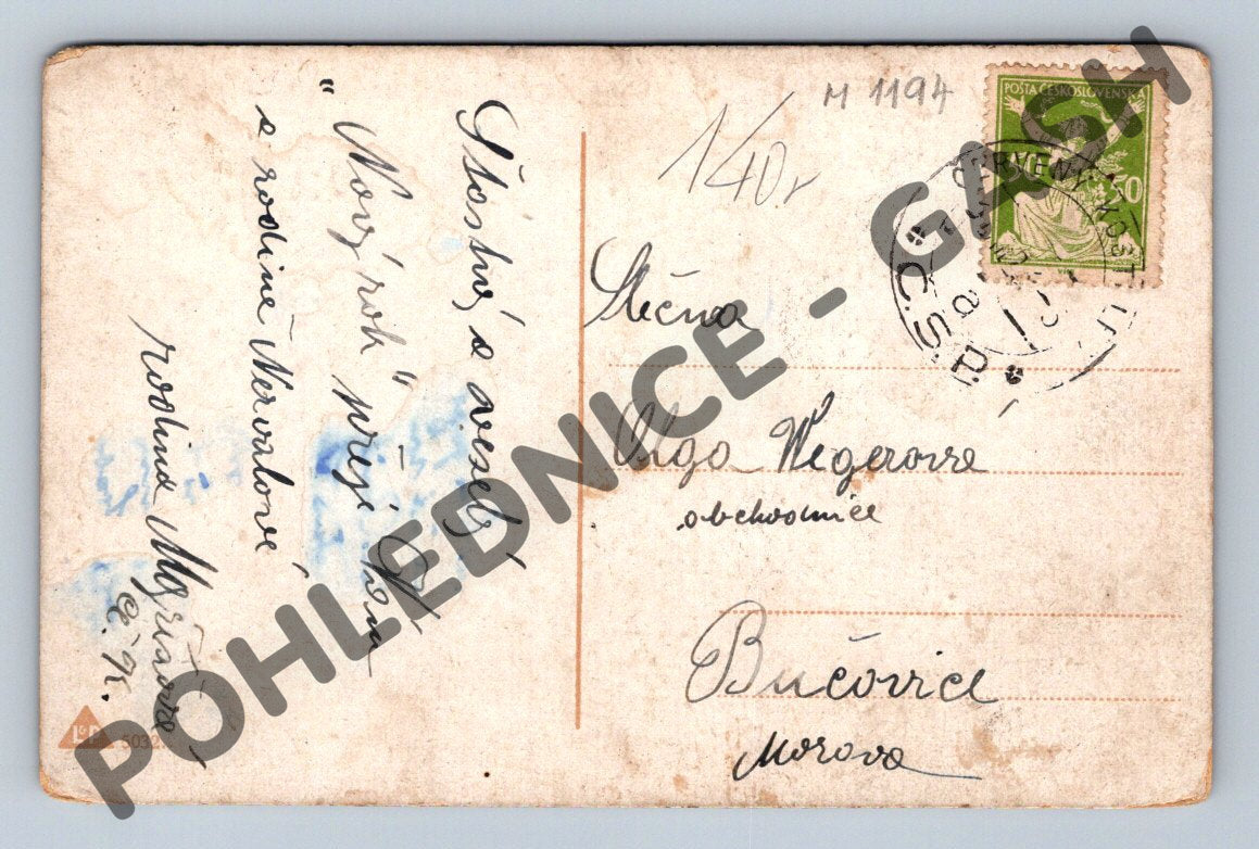 Starobylá československá pohlednice s motivem zimní noci a postav kráčejících po zasněžené ulici. V pozadí je vidět vesnický dům se zasněženou střechou a zářícím oknem, nahoře svítí měsíc s malovanou tváří. Pohlednice je ručně nadepsaná a prošla poštou – na zadní straně je čitelný rukopis, adresa a československá známka s razítkem. Pohlednice nese známky stáří (otřepy na krajích, lehké zašpinění), což svědčí o její autenticitě a sběratelské hodnotě. Odeslána byla do Břevičic na Moravě. Jedná se o unikátní kousek z období první poloviny 20. století vhodný pro sběratele historických pohlednic z Československa.