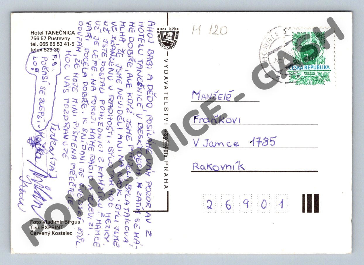 Originální pohlednice s motivem hotelu Tanečnica na Pustevnách v Beskydech. Na přední straně se nachází barevné fotografie hotelu zvenčí, interiéru restaurace a baru. Zadní strana je popsána rukou, opatřena známkou a poštovním razítkem. Pohlednice je ve velmi dobrém stavu, vhodná pro sběratele i milovníky regionální historie. Pustevny jsou známé svými dřevěnými stavbami a nádhernou přírodou Beskyd, což přidává pohlednici regionální hodnotu. Rozměry pohlednice odpovídají klasickému malému formátu. Skvělý kousek do každé sbírky!