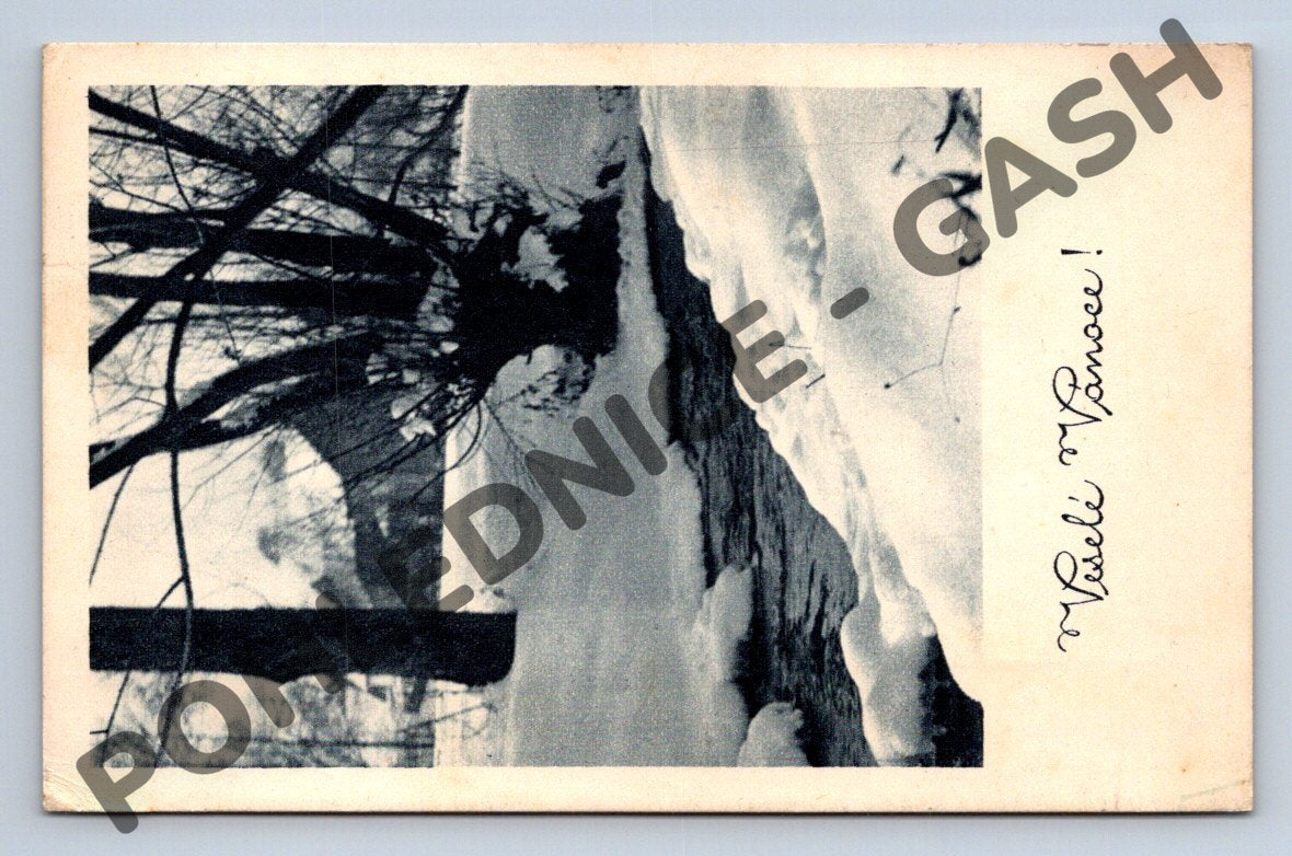 Starší černobílá pohlednice s motivem zimní krajiny a popiskem Veselé Vánoce! na přední straně. Pohlednice byla zaslána poštou, známka Československo, ručně psaný text i adresa na zadní straně. Pohlednice je ve sběratelském stavu s drobnými známkami stáří a opotřebení na hranách. Formát odpovídá malému formátu používanému před rokem 1950, vhodné pro sběratele historických pohlednic z České republiky.