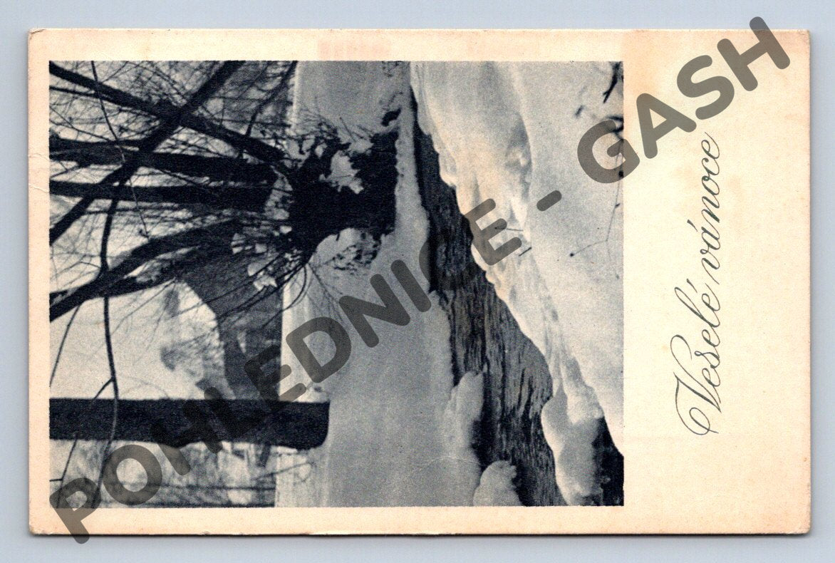Originální pohlednice s černobílou zimní krajinou a nápisem Veselé vánoce na přední straně. Na zadní straně je ručně psaný vánoční pozdrav, známka ČSR a razítko Trenčianské Teplice, datované. Kousky historie a nostalgie – vhodné pro sběratele i milovníky starých pohlednic. Stav viz foto, bez vážnějšího poškození, odpovídá stáří kartičky. Jedinečný doklad doby a způsobu komunikace před příchodem digitálního věku.