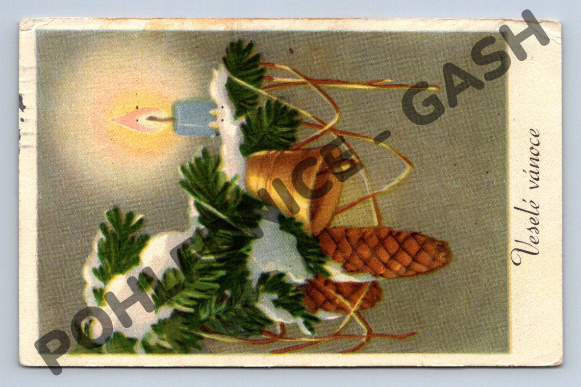 Originální vánoční pohlednice z období kolem roku 1947/1948, zaslaná z Prahy do Rakovníka. Na přední straně je krásná vánoční ilustrace se svíčkou, větvičkami jehličnanu, zvonkem a šiškou, s přáním Veselé vánoce . Zadní strana obsahuje rukou psané přání k vánocům a novému roku, originální poštovní známka s portrétem Štefana Kysela a poštovní razítko. Pohlednice je ve velmi dobrém sběratelském stavu, mírné opotřebení odpovídající stáří. Skvělý přírůstek do sbírky historických pohlednic s českou tematikou.
