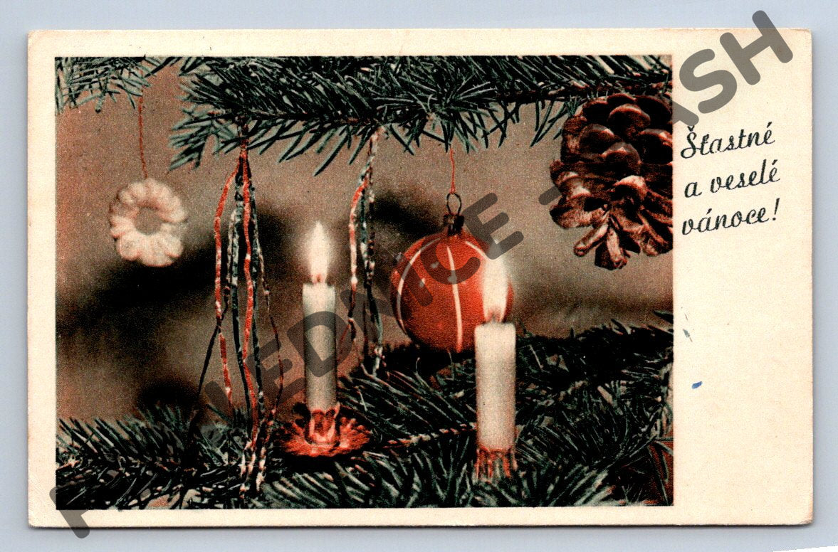 Originální československá vánoční pohlednice s přáním Šťastné a veselé Vánoce. Na přední straně je typická vánoční výzdoba: svíčka, vánoční baňka, šiška a cukroví zavěšené na větvi jehličnanu. Zadní strana je vyplněna ručně psaným textem s vánočním přáním, adresou a známkou ČSR v hodnotě 1,20 Kčs, orazítkovaná v Novém Jičíně. Pohlednice je datována rokem 1947. Sbírkový stav, vhodné pro sběratele historických pohlednic nebo milovníky vánočních motivů.