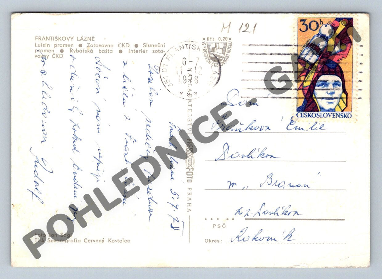 Originální pohlednice z lázeňského města Františkovy Lázně. Na přední straně je koláž několika typických motivů tohoto známého lázeňského města – kolonáda, památník, interiér jídelny, jezírko a lázeňský dům. Pohlednice byla použita, na zadní straně je zachovalá ručně psaná zpráva, datum odeslání i poštovní známka z doby Československa. Atraktivní sběratelský kousek pro zájemce o pohlednice z českých lázeňských měst či historické pohledy z období první poloviny 20. století. Stav viz foto.
