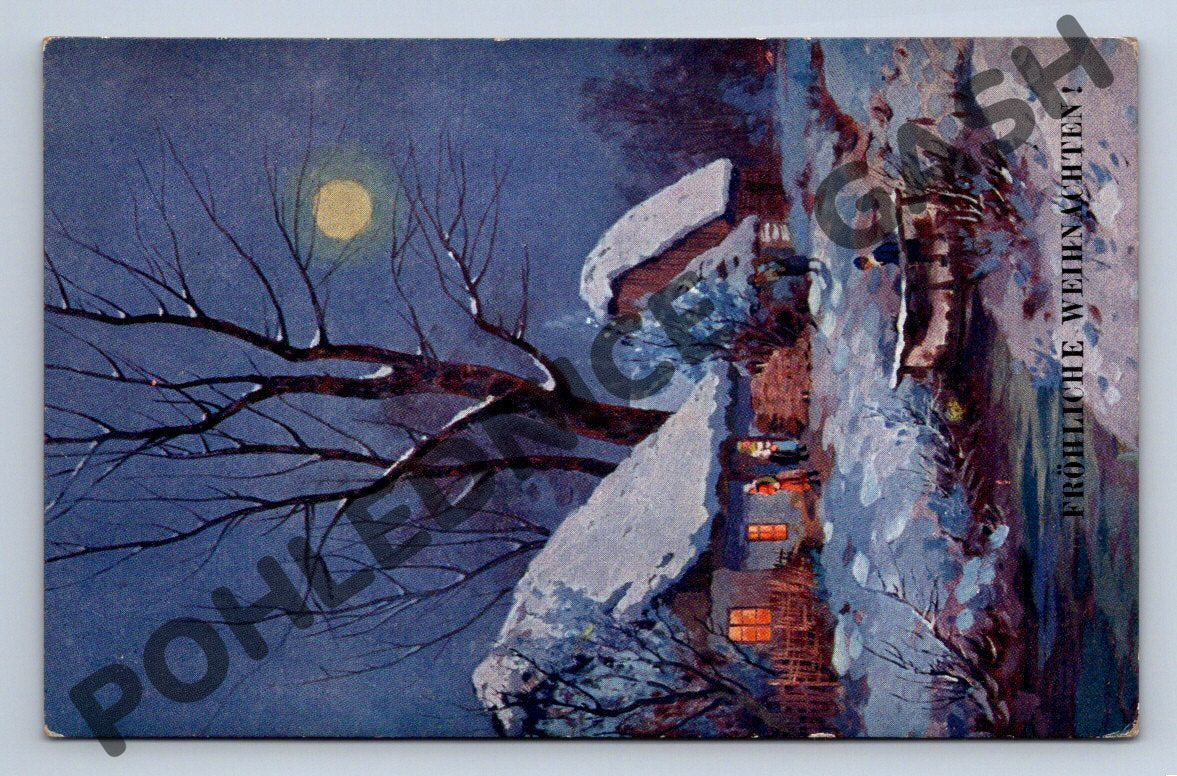 Nabízím originální malovanou pohlednici s motivem zimní vesnické krajiny při měsíčku a s německým nápisem Fröhliche Weihnachten! (Veselé Vánoce!). Na pohlednici je znázorněna zasněžená chalupa, stromy a svítící okna večerního domu. Rubová strana je nevyplněná, dobře zachovalý stav, pouze drobné známky stáří. Krásný sběratelský kousek s vánoční tematikou vhodný nejen pro sběratele, ale i jako nostalgická dekorace.