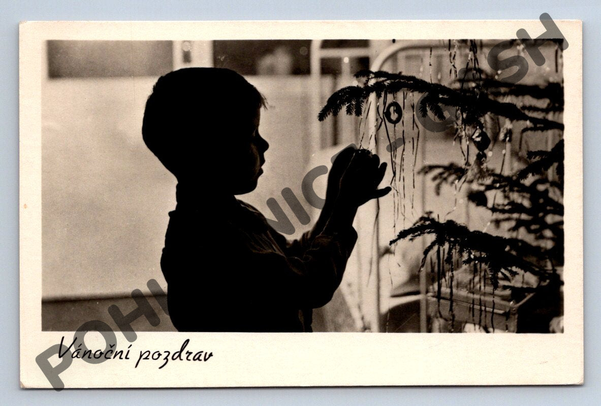Nabízím originální černobílou pohlednici s vánoční tématikou, na které je vyobrazen siluetový portrét dítěte vedle ozdobeného vánočního stromku. Na přední straně je nápis Vánoční pozdrav. Na zadní straně pohlednice je ručně psaný vzkaz, poštovní razítko z 23. 12. 1960 a adresa adresáta. Jedná se o zajímavý sběratelský kousek dokumentující atmosféru Vánoc a způsob korespondence v tehdejším Československu. Pohlednice je v dobrém sběratelském stavu, s mírnými známkami stáří nebo opotřebení, odpovídajícími věku. Autor fotografie: Jar. Štencl.