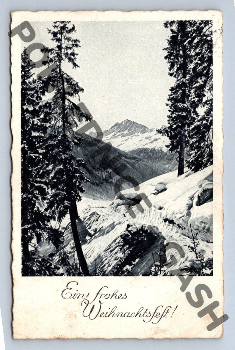 Starší vánoční pohlednice menšího formátu s německým nápisem Ein frohes Weihnachtsfest! na přední straně, zobrazující zimní krajinu s horami a zasněženými větvemi stromů. Na zadní straně je český rukopisný text, známka Deutsches Reich a adresování do Protektorátu Čechy a Morava. Pohlednice je datována okolo období druhé světové války. Celkově zachovalý stav, místy drobná zašpinění a mírné opotřebení okrajů (viz foto). Vhodné pro sběratele historických pohlednic s tematikou ČR či vánočních přání.