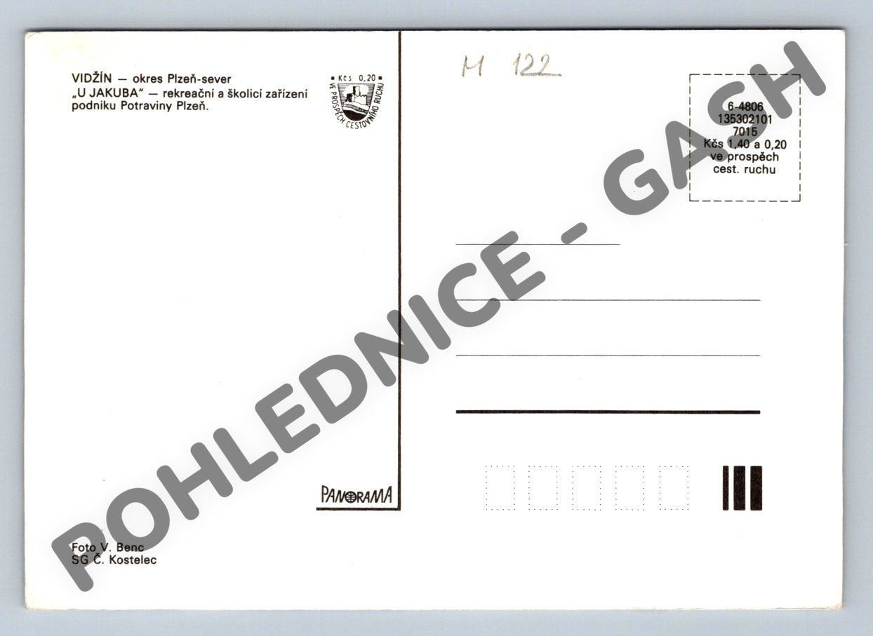 Pohlednice zachycuje zimní scenérie obce Vidžín v okrese Plzeň-sever. Na přední straně jsou zachyceny významné budovy, kostel i rekreační zařízení včetně areálu 'U Jakuba', který sloužil jako rekreační a školící zařízení podniku Potraviny Plzeň. Nechybí typická architektura českého venkova a krásné sněhové kulisy, které dotvářejí atmosféru vesnického života v zimě. Zadní strana obsahuje popis, prostor pro známku, adresu a krátké informace o lokalitě. Pohlednice je ve velmi dobrém stavu, bez popisu i známky, vhodná pro sběratele regionálních českých pohlednic.