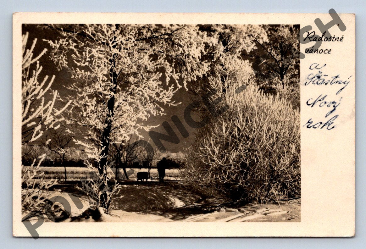 Starobylá vánoční pohlednice se zimní krajinou, Československo