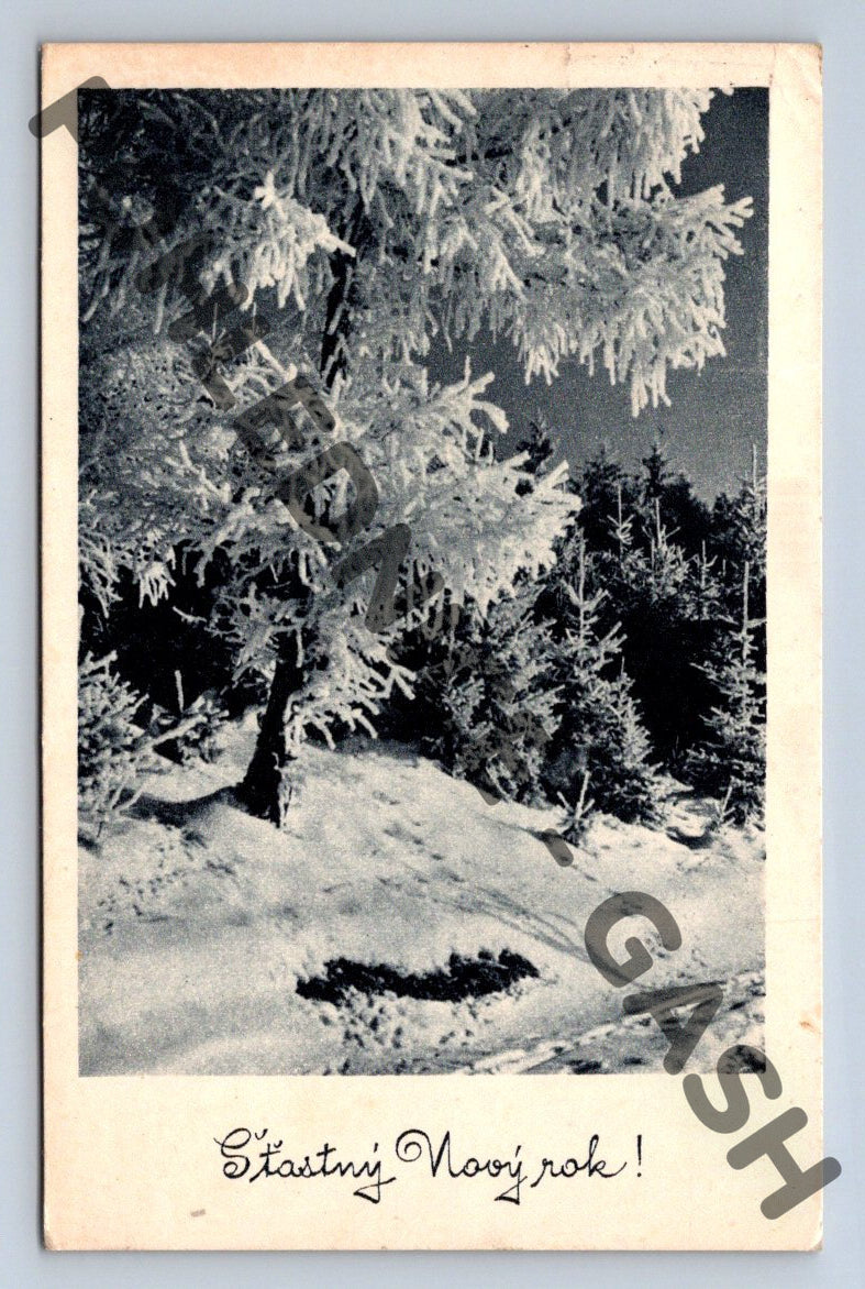 Starší černobílá pohlednice s novoročním motivem – zasněžené větve stromů. Na přední straně je nápis „Šťastný Nový rok!“. Zadní strana obsahuje poštovní známku z období Československa, rukopisné věnování a adresu. Pohlednice je ve slušném sběratelském stavu, odpovídá běžnému opotřebení včetně drobných známek stáří.