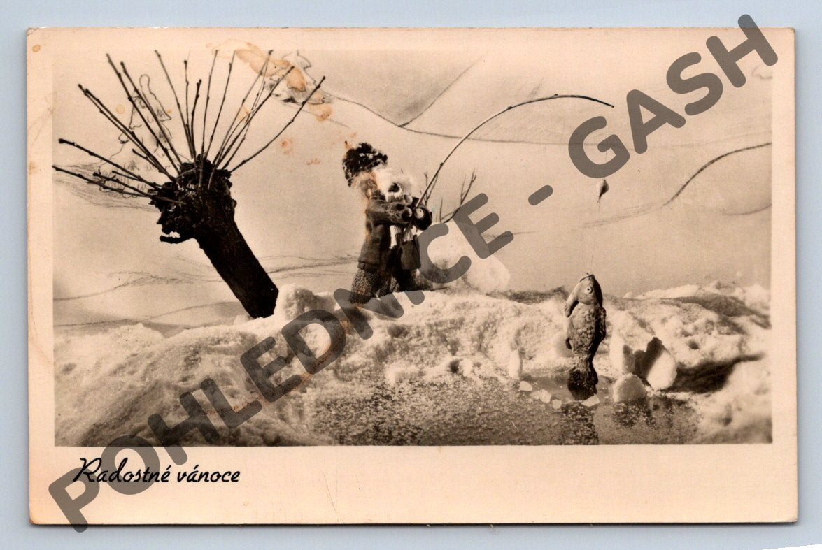 Starší československá pohlednice s přáním Radostné vánoce. Na fotografii je zimní scéna s dětskou postavou stojící ve sněhu, u březového stromu s udicí a rybou, což symbolizuje vánoční atmosféru s tradičními motivy. Pohlednice byla odeslána, chybí perforace, razítko a známka Československo (30 haléřů) s portrétem prezidenta. Na zadní straně rukopisné věnování a adresa. Autorem fotografie je Ferdinand Bučina, vydavatel ORBIS, cena původně 0,50 Kčs. Jedná se o autentický sběratelský kus vhodný pro milovníky historie a pohlednic s tématem Vánoc ze starého Československa.