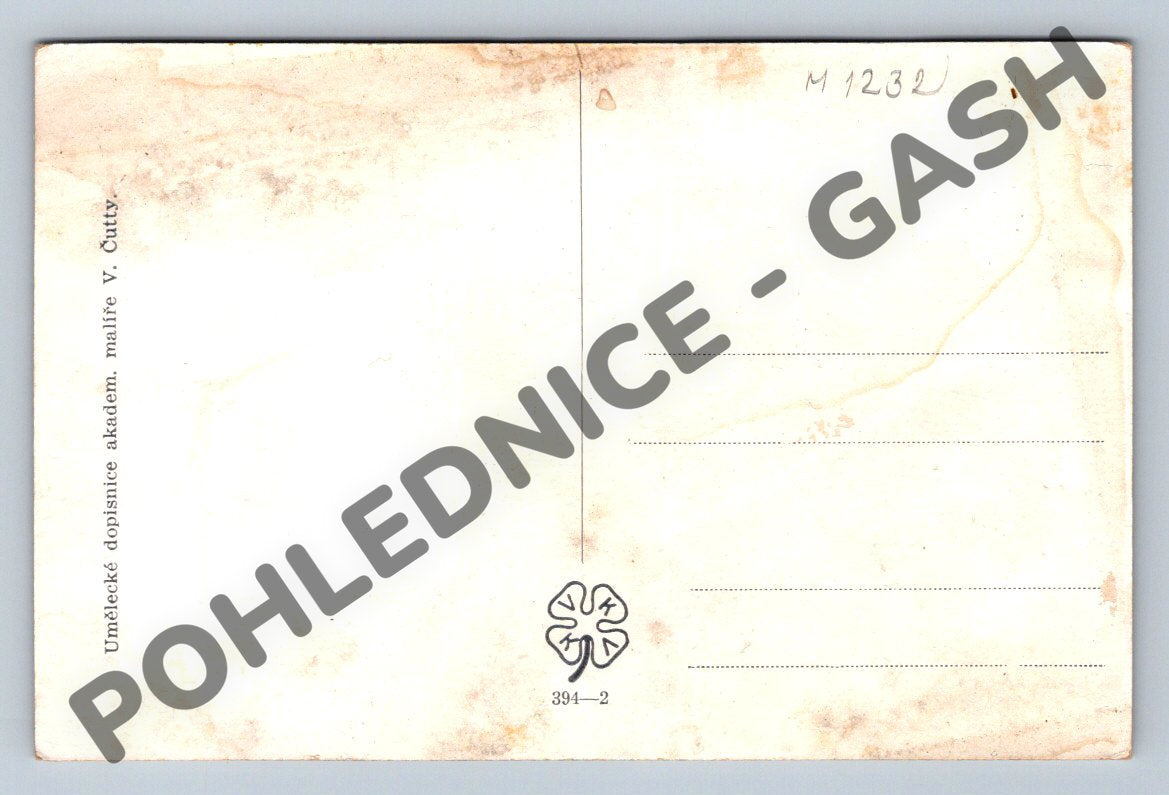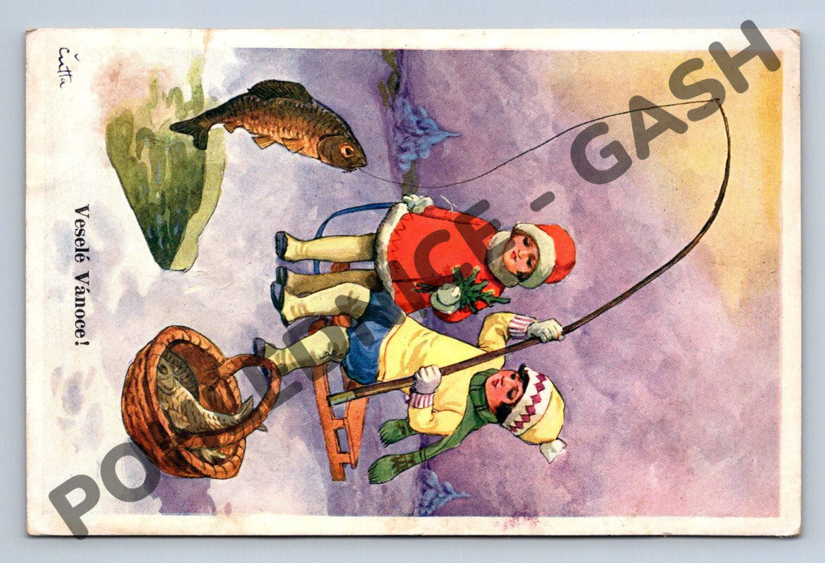 Vánoční pohlednice české provenience, malý formát, pravděpodobně z první poloviny 20. století. Ilustrovaný motiv dětí na rybách, jedna z nich právě vytahuje rybu, další sedí na lavičce poblíž košíku s rybou. Pohlednice je z dílny akademického malíře V. Čutty, vydaná jako umělecká dopisnice. Typický vánoční motiv s přáním Veselé Vánoce! . Stav odpovídá stáří, na reversu lehké stopy po manipulaci a starém skladování, viz fotografie.