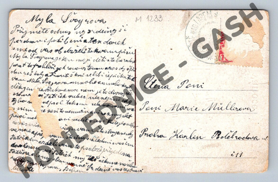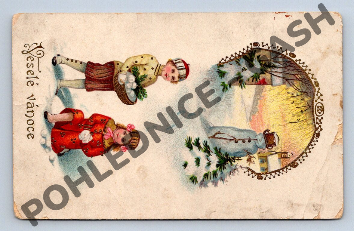 Starobylá vánoční pohlednice s českým textem Veselé vánoce a ilustrací dětí ve sněhu. Motiv je bohatě zdobený, barevná litografie zachycuje dvě děti s dárky a sněhovými koulemi, v pozadí je zimní krajina a stylizované rámečky, typické pro secesní a raně meziválečné období. Na zadní straně je původní rukopisné věnování, poštovní známka a razítko, což dokládá dobovou autenticitu. Pohlednice nese známky stáří – opotřebení a lehké poničení rohu i známky poštovního oběhu (razítko, chybějící kousek papíru ze známky). Skvělý sběratelský kus pro milovníky starých vánočních pohlednic a nostalgického umění z období první poloviny 20. století.
