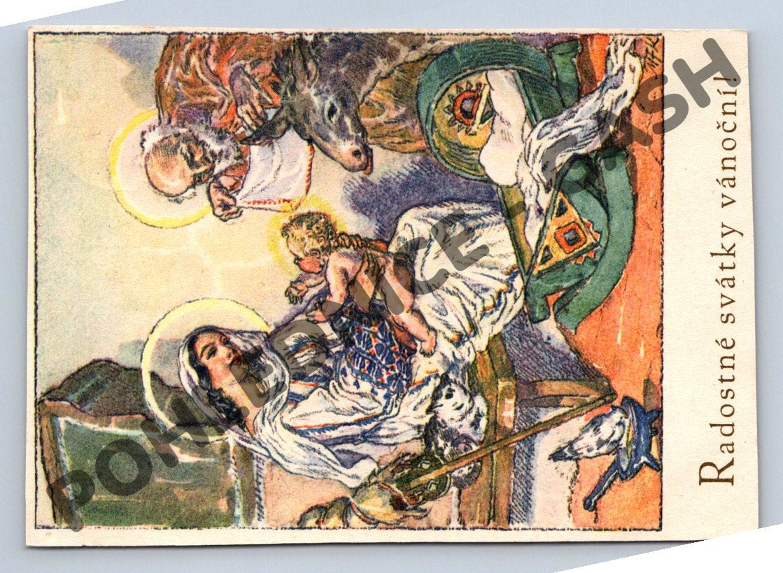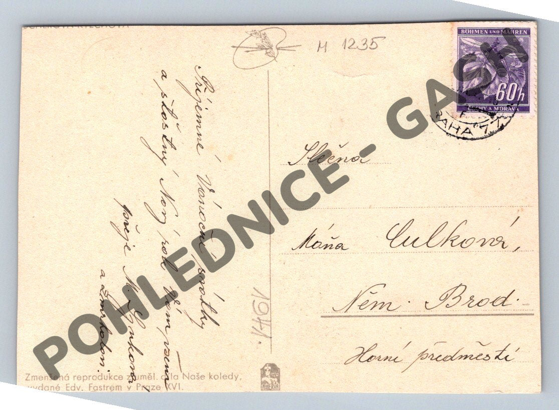Vánoční pohlednice formátu malý, odeslaná roku 1941 na území Protektorátu Čechy a Morava, jak dokládá dobová známka a poštovní razítko. Přední strana je zdobena barevnou reprodukcí umělecké malby se scénou narození Ježíška: Svatá rodina s Ježíškem v jesličkách, sv. Josefem a Pannou Marií, doplněná nápisem Radostné svátky vánoční!. Pohled je adresován slečně Maňa Culková, Něm. Brod – Horní předměstí. Na zadní straně rukou psané originální věnování a podpis odesílatele. Výrazný sběratelský a historický artefakt, doklad čs. vánoční korespondence 1. poloviny 20. století.