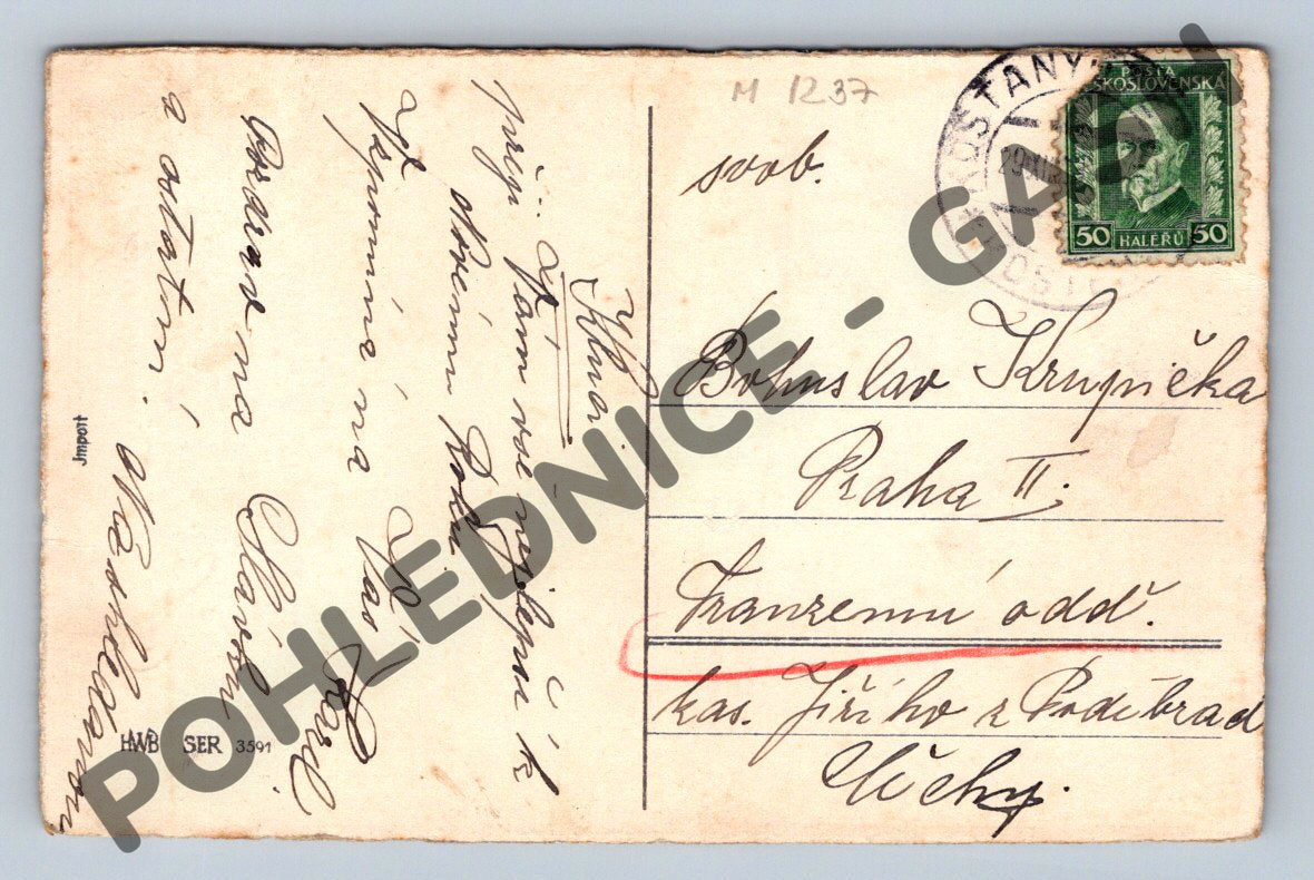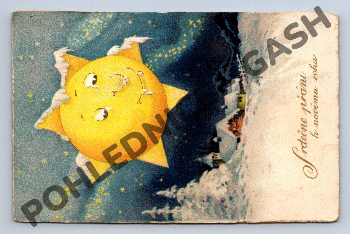 Originální stará pohlednice s motivem usmívajícího se slunce nad zasněženou vesničkou, doplněná přáním k novému roku. Pohlednice byla odeslána z Československa, obsahuje dobové ručně psané věnování a známku s portrétem prezidenta T. G. Masaryka v hodnotě 50 haléřů. Na zadní straně známky a poštovní razítko. Jedná se o krásný nostalgický kus s výraznou kresbou a vánočně-novoroční tématikou, vhodný do sbírky starých pohlednic. Stav odpovídá stáří – drobné opotřebení hran, jinak pěkně zachovalá.