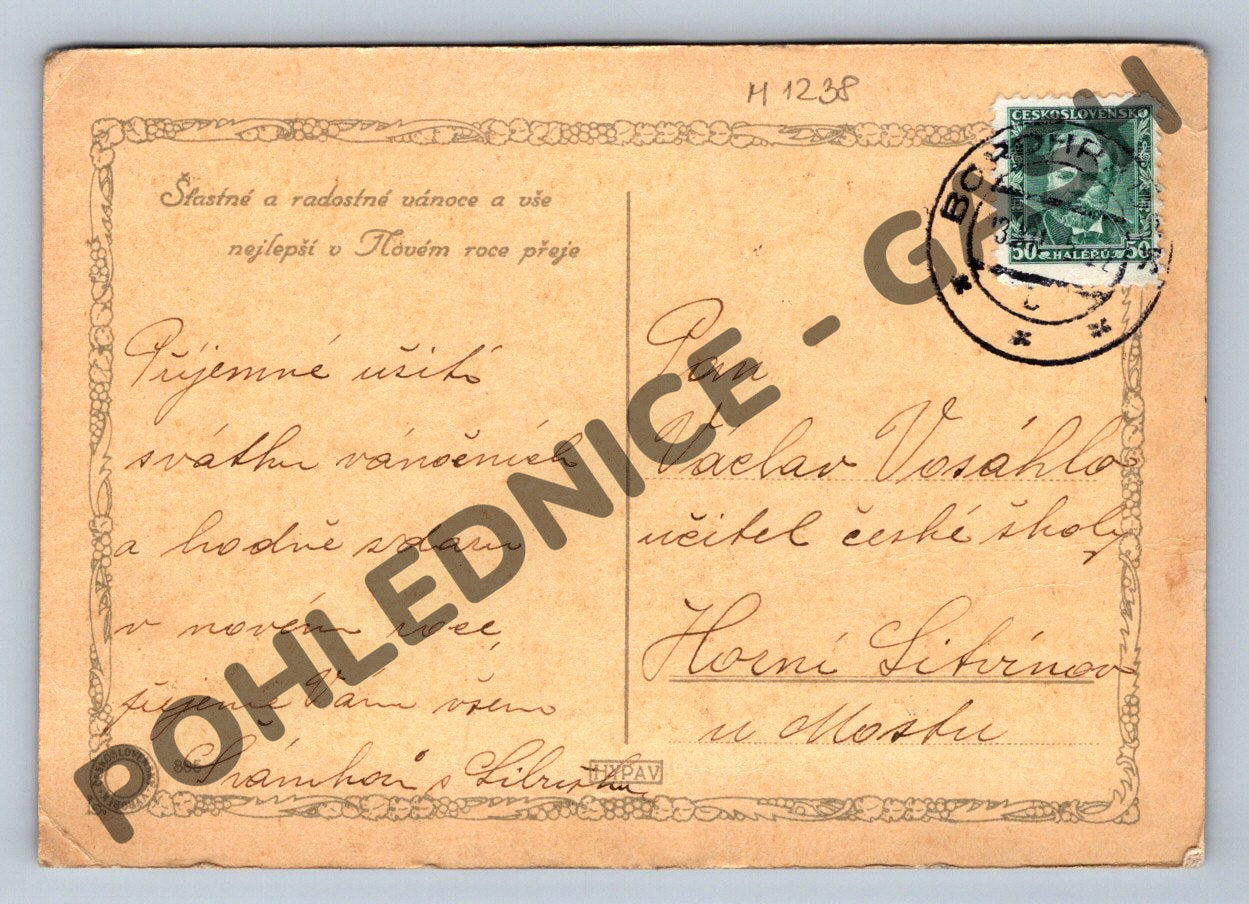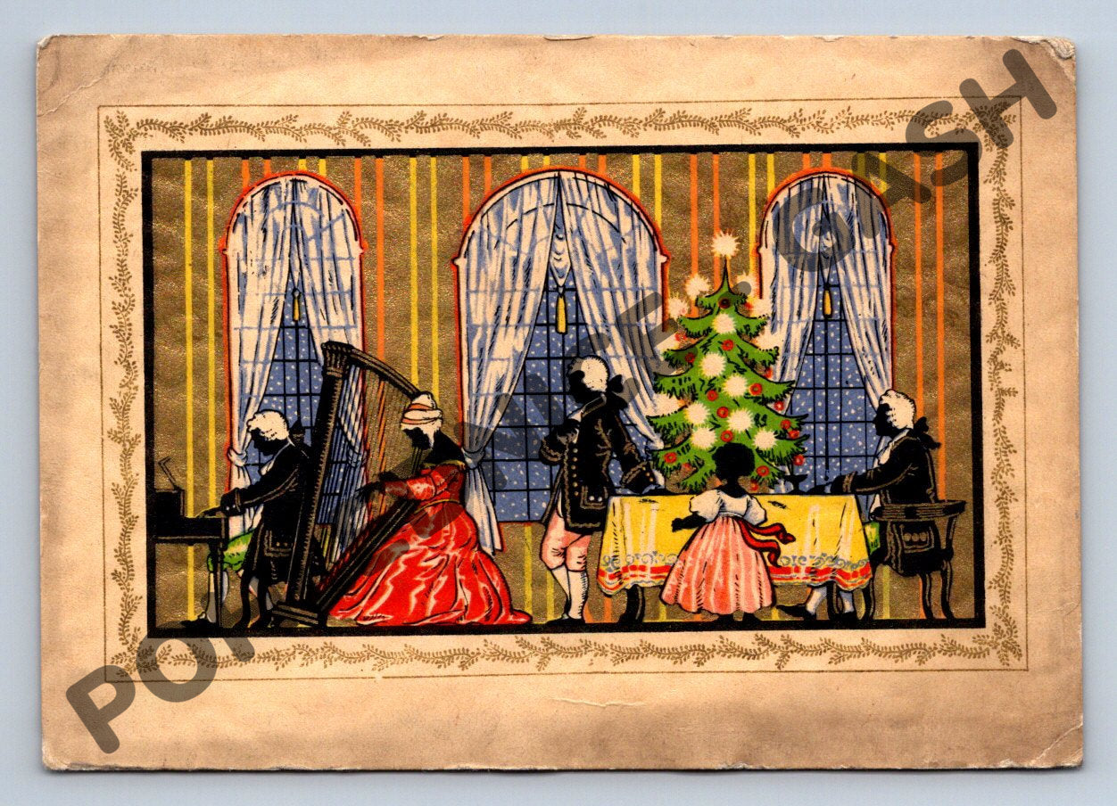 Originální staročeská vánoční pohlednice z období první poloviny 20. století. Pohlednice zobrazuje sváteční interiér s rodinou u vánočního stromečku, ve stylizovaném historickém oděvu – žena hrající na harfu, muž u klavíru a další členové rodiny. Celá scéna je zasazena do zdobeného rámečku a působí velmi nostalgicky a svátečně. Zadní strana obsahuje ručně psané věnování a dobovou poštovní známku Československo 50 haléřů s razítkem. Skvělý sběratelský kousek vhodný pro milovníky starých českých pohlednic, vánočních motivů či etnografie. Stav viz foto, menší známky stáří a opotřebení na hranách.