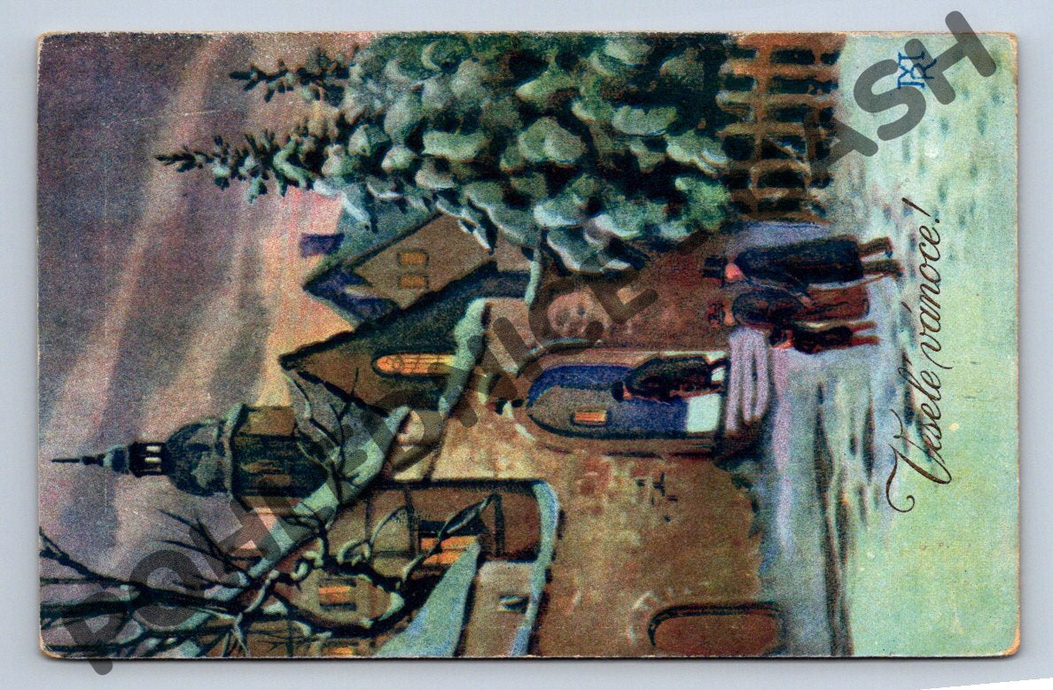 Originální stará pohlednice s vánočním motivem zasněženého kostela a přicházejících postaviček. Na přední straně je barevná ilustrace s nápisem Veselé vánoce!. Pohlednice byla odeslána z Peruce do Kolína s poštovní známkou ČSR a razítkem. Zadní strana obsahuje adresu i ručně psané věnování a přání, což dokládá její dobovou autentičnost. Ideální pro sběratele historických českých pohlednic a vánočních témat. Stav dle fotografií – známky stáří a užívání.