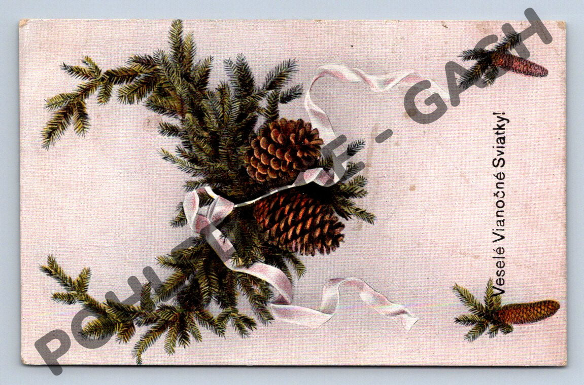 Starobylá vánoční pohlednice zaslaná roku 1923, s motivem větviček jehličnanu, šišek a bílé stuhy, doplněná slovenským nápisem Veselé Vianočné Sviatky!. Pohlednice je opatřena dobovou známkou a autentickým rukopisným přáním. Ideální pro sběratele historických pohlednic i zájemce o staré vánoční motivy. Celkový stav odpovídá stáří, známky mírného opotřebení (viz foto).