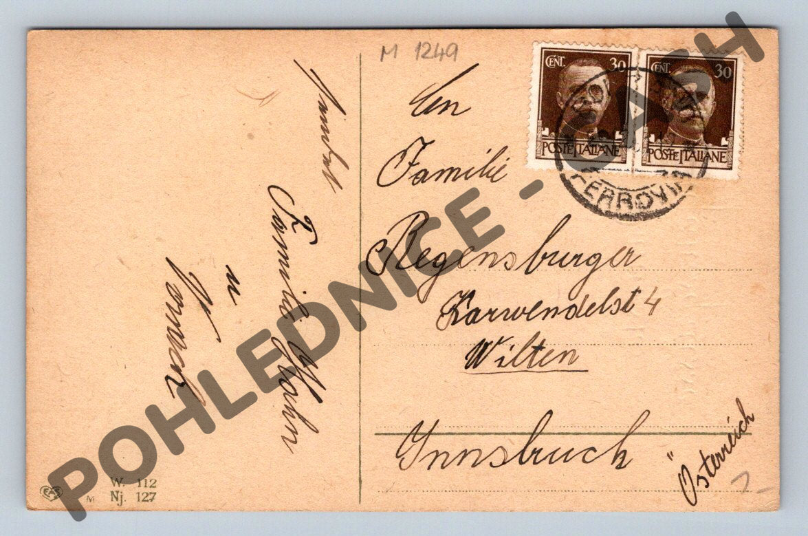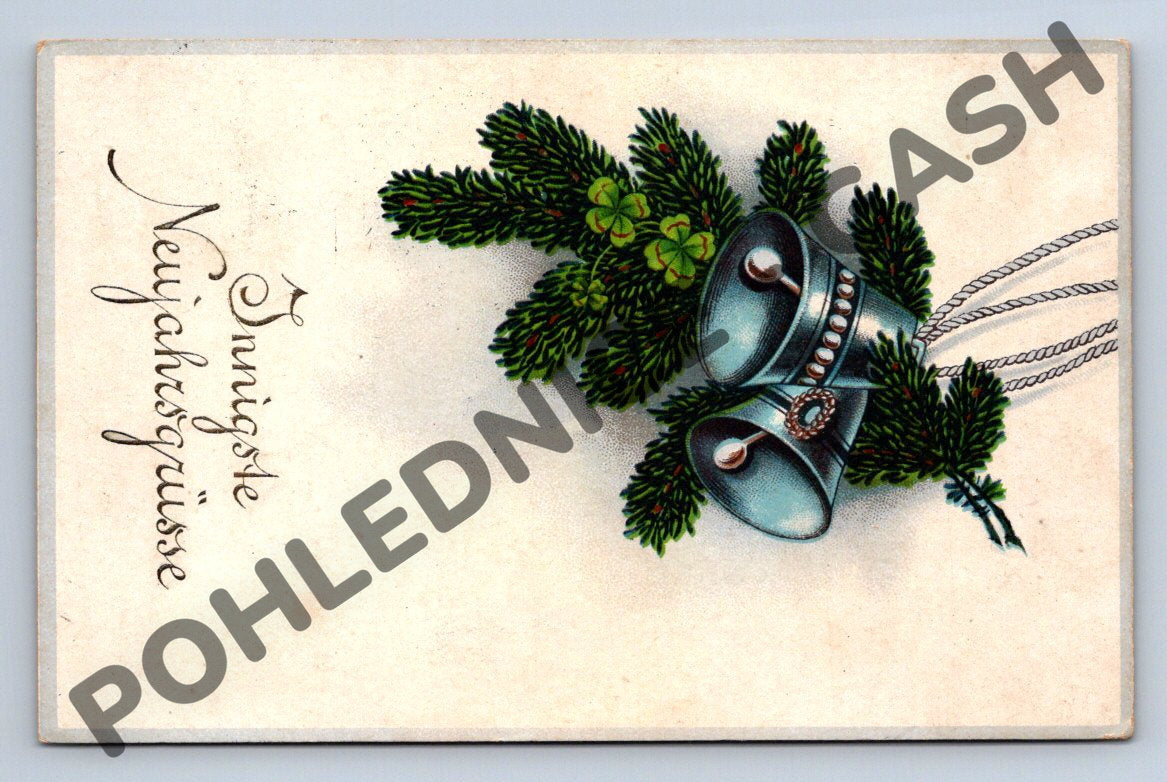 Starobylá novoroční pohlednice se zajímavým výjevem – stylizovaným novoročním přáním v němčině s motivem zvonků, jmelí a zelených větviček. Na zadní straně jsou dvě poštovní známky Itálie s portrétem, razítkování FERROVIA (železnice), adresována do Innsbrucku (Rakousko). Pohlednice je ve velmi zachovalém stavu, s ručně psaným textem, krásnou patinou a původními známkami. Skvělý sběratelský kousek z období cca první poloviny 20. století, vhodný pro sběratele pohlednic, filatelisty nebo milovníky nostalgických novoročních přání.