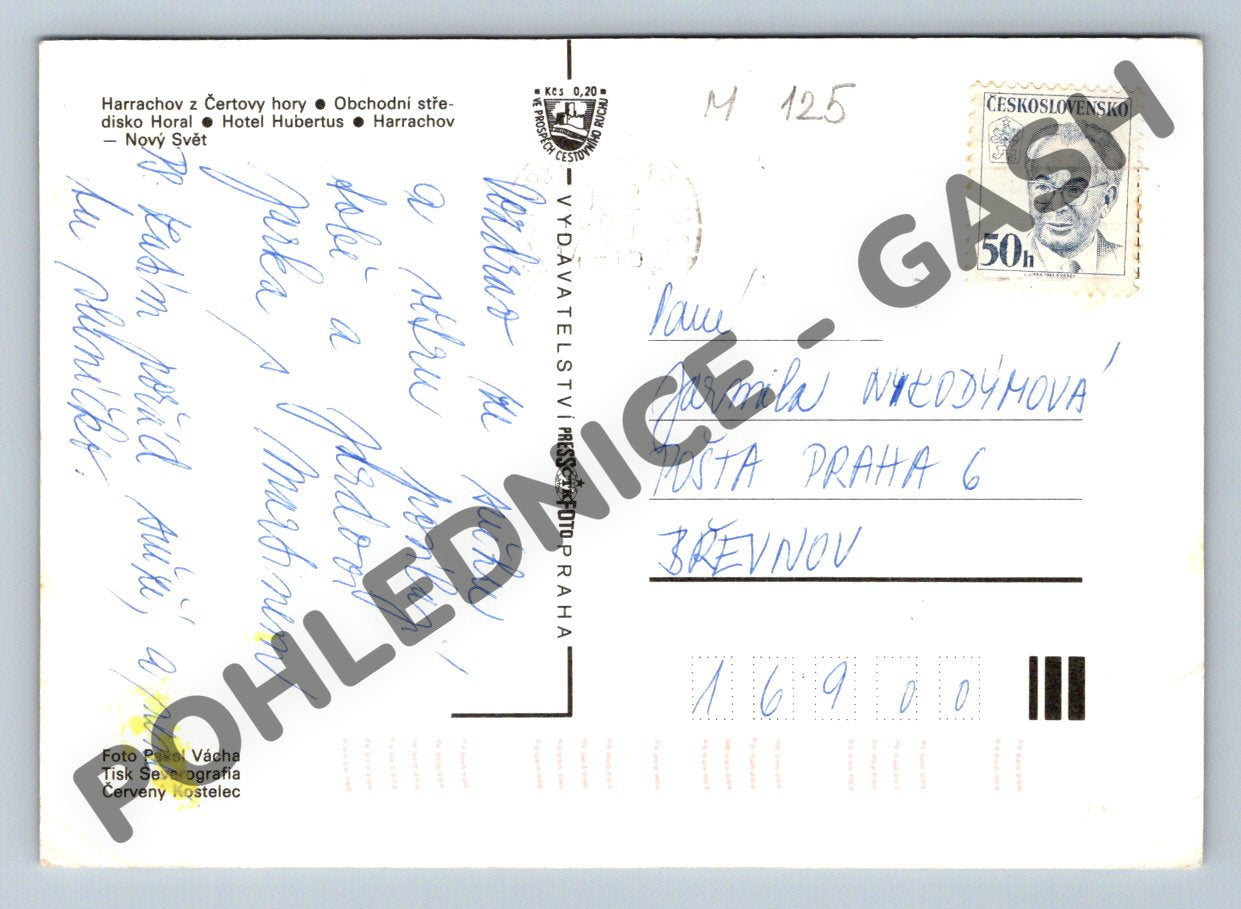 Originální pohlednice z oblasti Krkonoš, konkrétně z Harrachova. Pohlednice zachycuje zimní scenérie města Harrachov i okolních kopců a hor, včetně náměstí se známým obchodním střediskem Horal. Na přední straně najdeme více fotografií s pohledem na ulice zasněženého horského městečka včetně typické architektury horských domků. Zadní strana je popsána, včetně staré československé poštovní známky s podobiznou prezidenta a originálním vlastnoručním psaním. Vydal MPressFoto Praha, fotografie autor Pavel Vácha. Ideální sběratelský kousek pro milovníky českých pohlednic a Krkonoš.
