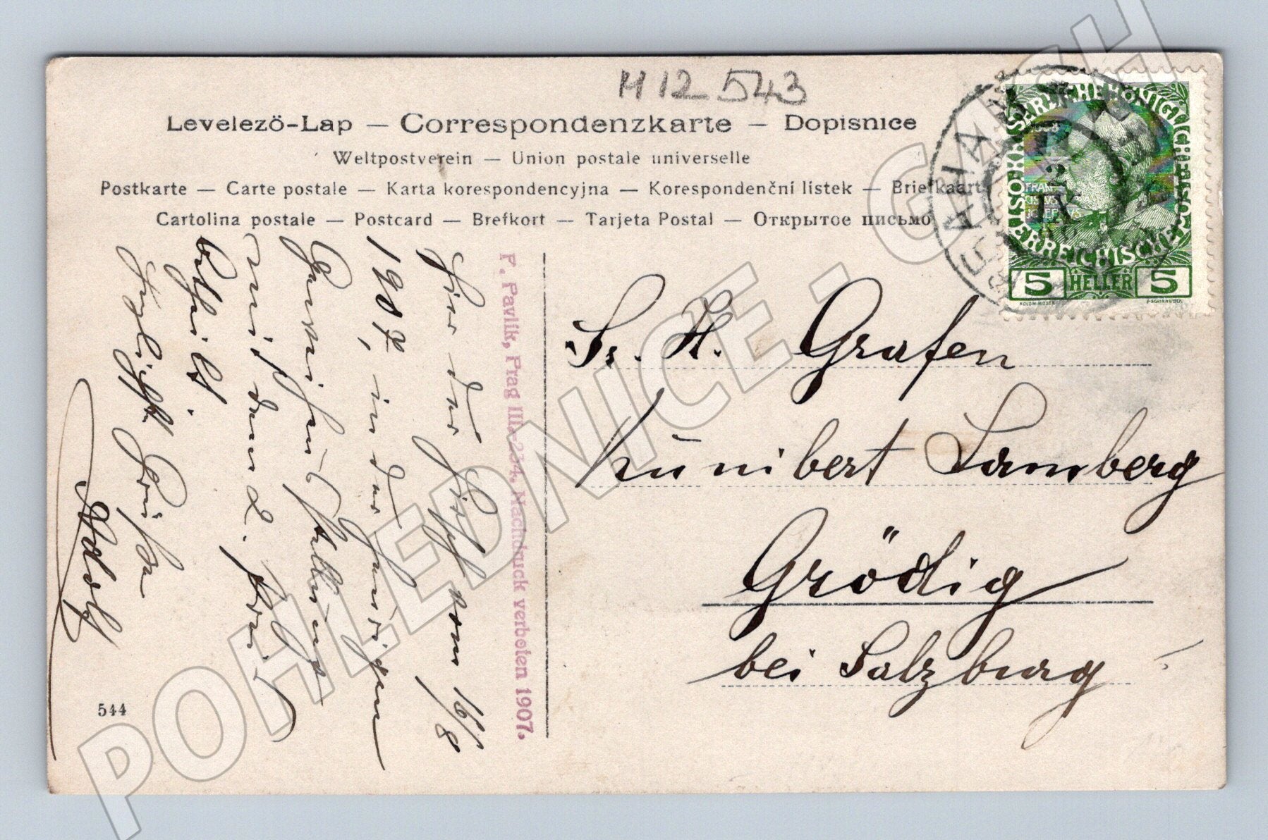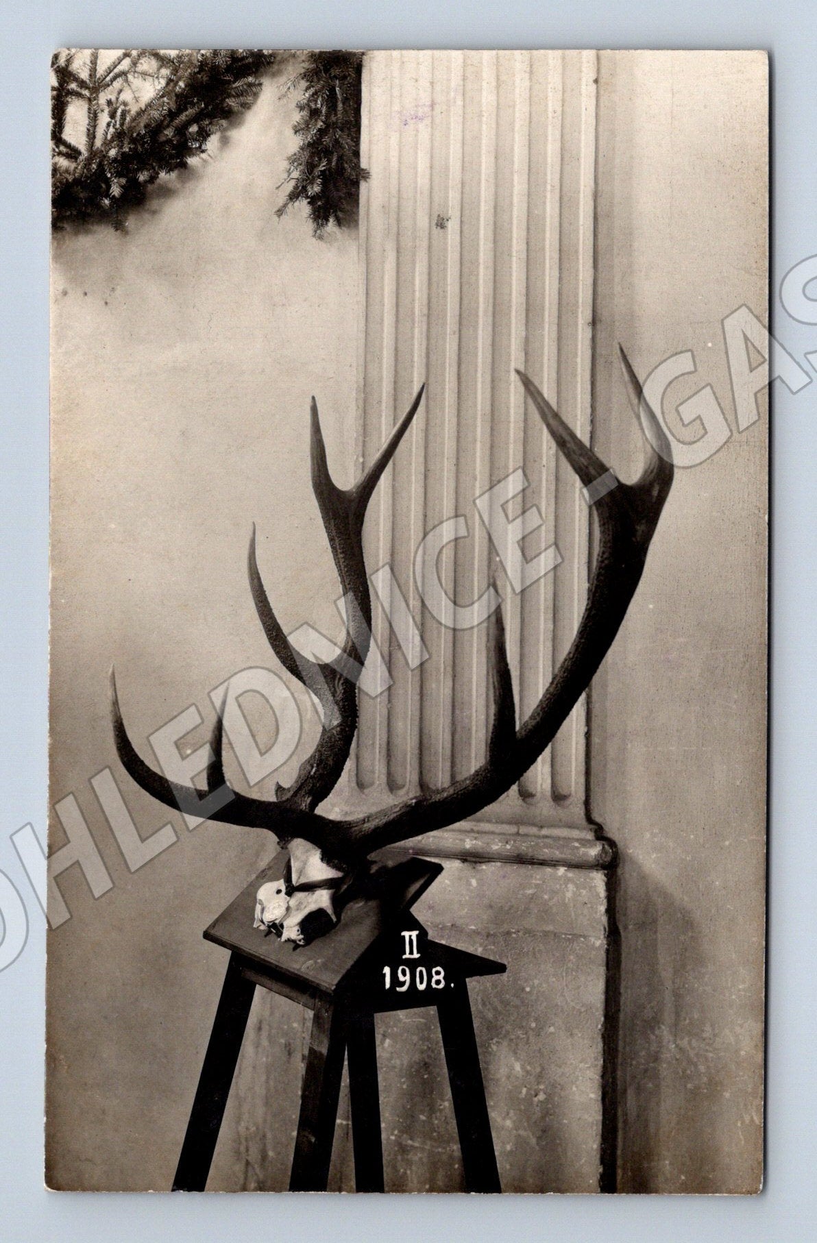 Originální historická černobílá pohlednice z roku 1908 s fotografií lovecké trofeje – paroží. Pohlednice je zaslaná, opatřená známkou 5 hellerů Rakousko-Uherska a poštovním razítkem. Na zadní straně je ručně psaný text v němčině a adresát v Grödig u Salzburgu. Karta je v dobrém sběratelském stavu s drobnými známkami stáří a opotřebení, viz foto. Ocení ji zejména sběratelé starých pohlednic, myslivosti nebo historie. Rozměry klasického formátu, vydavatel F. Perlls, Praha.