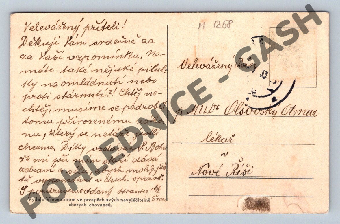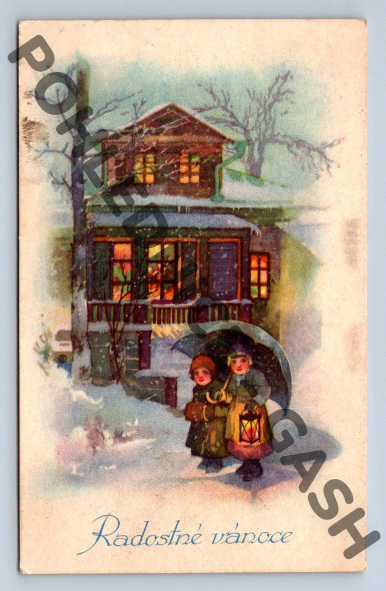 Starobylá česká vánoční pohlednice s motivem dvou dětí pod deštníkem před zasněženým domem a nápisem Radostné vánoce. Pohlednice byla vydána ve prospěch nemocných chovanců Vincetina a je na ní ručně psaný pozdrav v češtině adresovaný lékaři v Nové Říši. Pohlednice nese známky stáří, na přední straně jemné opotřebení rohů a drobné skvrny. Výjimečný sběratelský kousek s autentickou atmosférou Vánoc první poloviny 20. století. Formát malý, datace do roku 1950.