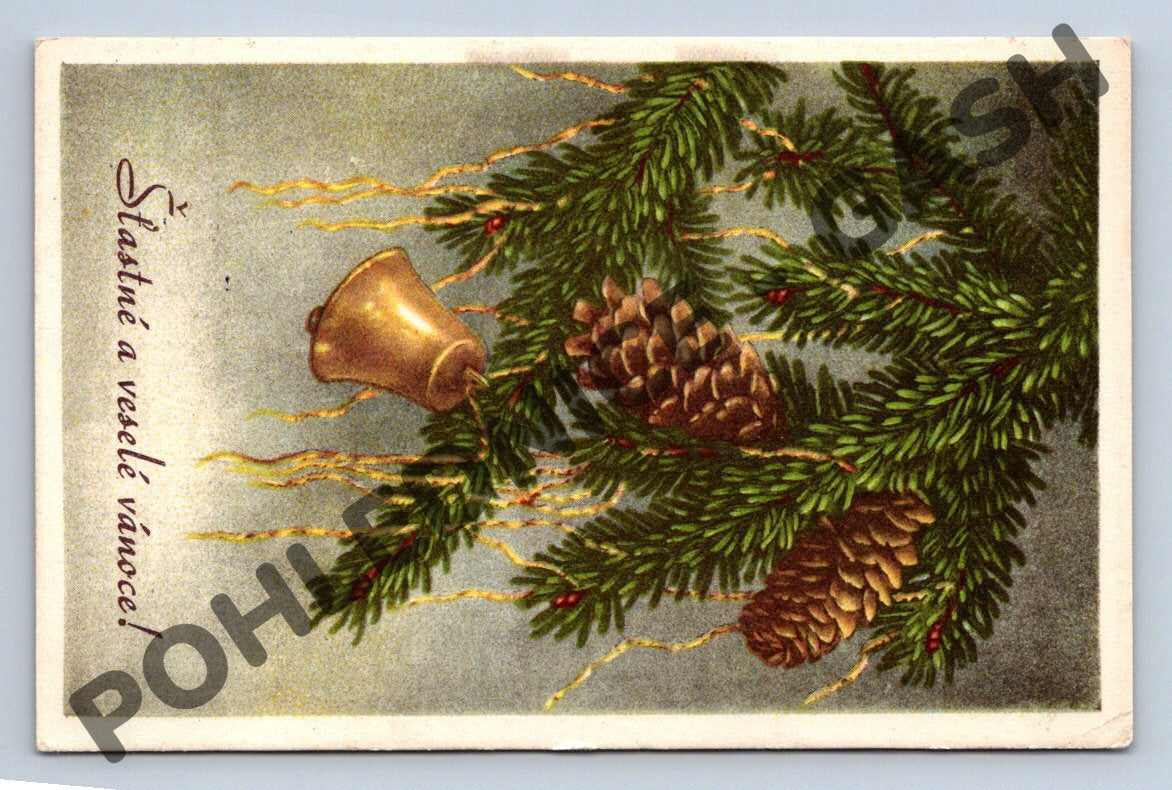 Originální stará vánoční pohlednice z Československa, malý formát, datovaná podle známky a způsobu provedení pravděpodobně do roku 1950. Na lícové straně je krásný vánoční motiv se zlatým zvonkem, smrkovými větvemi a šiškami s českým nápisem Šťastné a veselé vánoce!. Rubová strana obsahuje rukou psané věnování, adresu a poštovní známku s razítkem. Pohlednice je velmi dobře zachovalá, vhodná pro sběratele historických pohlednic a milovníky vánočních motivů. Skvělý doplněk do sbírky i jako nostalgická dekorace.