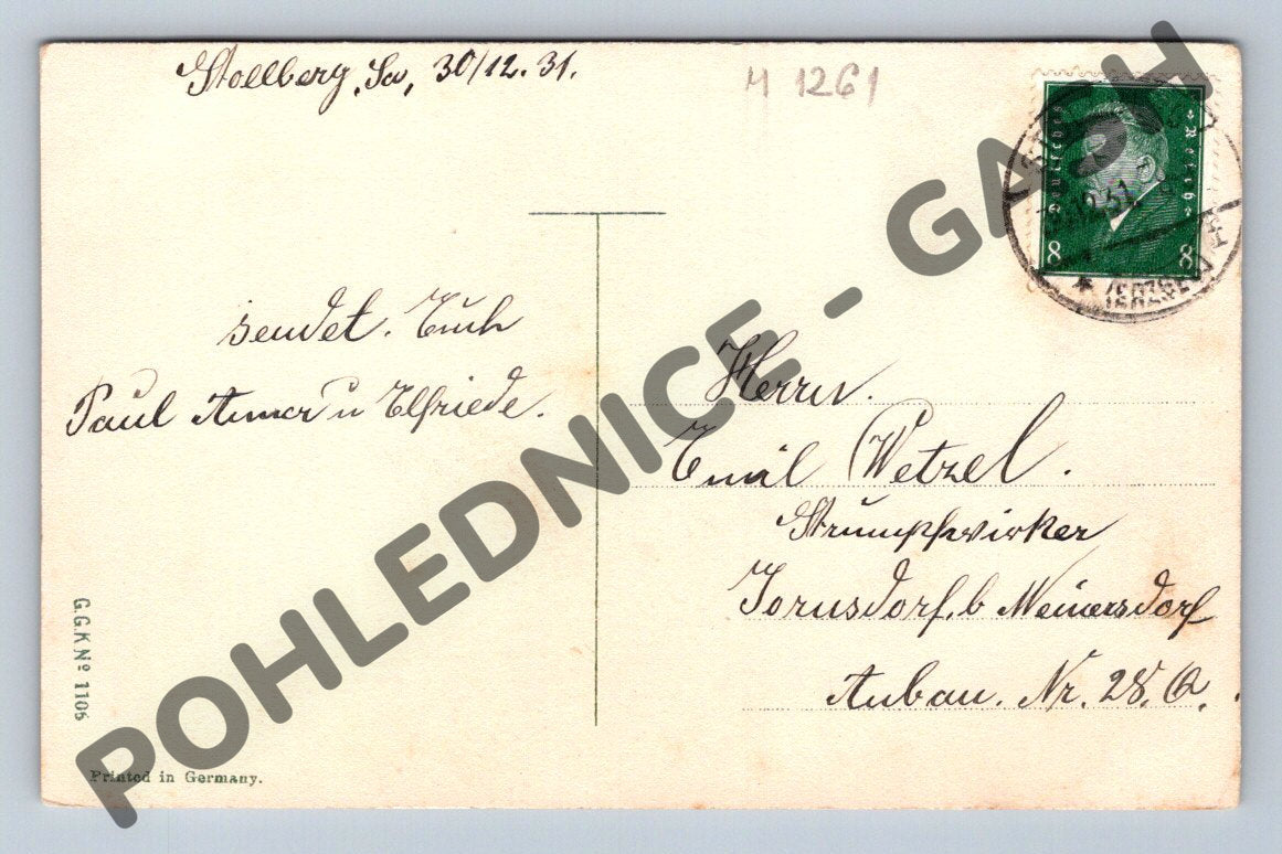 Zimní pohlednice Německo 1931 – přání Nový rok, razítko, známka