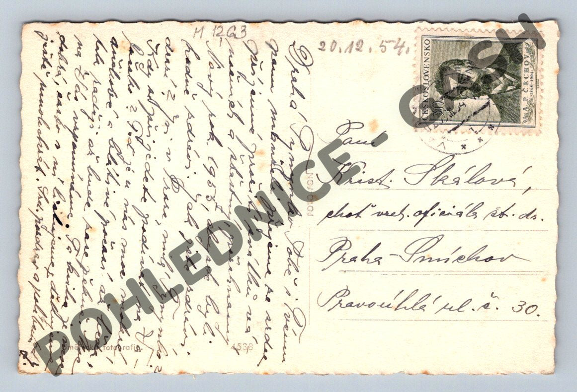 Originální historická pohlednice s přáním k Novému roku. Na pohlednici je zimní přírodní scéna s altánkem pokrytým sněhem, doplněná ručně psaným přáním Mnoho štěstí v Novém roce! v češtině. Zadní strana pohlednice je celá popsaná rukou a opatřená známkou z tehdejšího Československa, datováno 20.12.1954. Jedná se o krásný sběratelský kus, který zachycuje atmosféru Vánoc a novoročních přání padesátých let minulého století. Pohlednice nese známky stáří – drobné skvrny a opotřebení okrajů. Výjimečný doplněk do každé sbírky historických pohlednic.