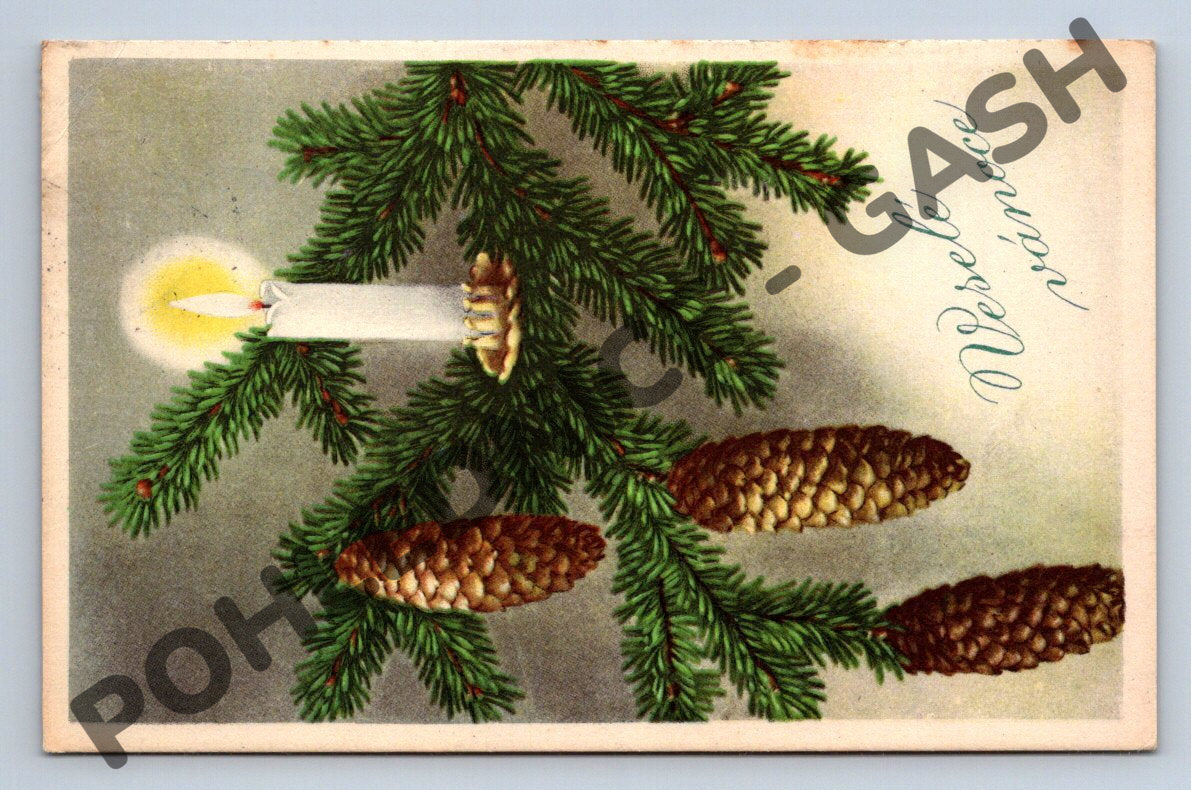 Starobylá česká vánoční pohlednice menšího formátu, datovaná rokem 1949. Na lícové straně je malebný motiv větvičky jehličnanu s ozdobnými šiškami a zapálenou svíčkou, doplněný textem Veselé Vánoce . Zadní strana je ručně popsána s adresou, opatřena původní československou známkou a razítkem. Pohlednice představuje pěkný sběratelský kousek s atmosférou poválečných Vánoc. Vhodné pro sběratele historických pohlednic, milovníky vánočních motivů nebo jako netradiční vánoční dekorace.
