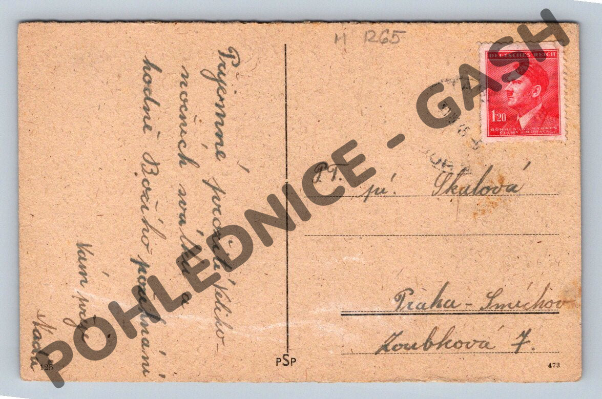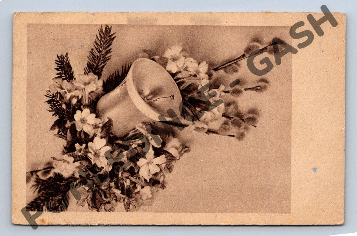 Originální pohlednice malého formátu z období do roku 1950. Pohlednice má černobílý motiv s květinovou vazbou a velikonoční svíčkou, vhodná jako tematická velikonoční gratulace. Na zadní straně je ručně psaný text v češtině a poštovní známka Německé říše s portrétem. Sbírkový kousek pro milovníky historie, pohlednic i filatelie. Stav odpovídá stáří, mírná patina a známky používání, viz foto.