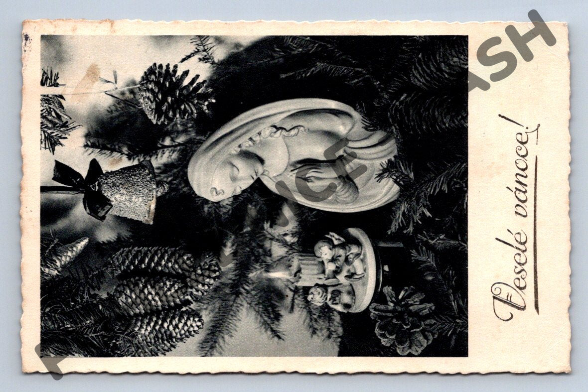 Starý československý vánoční pohled z roku 1938 odeslaný z Prahy. Pohlednice je malého formátu a na přední straně je černobílý motiv betléma s nápisem Veselé Vánoce! obklopený větvičkami jedle a šiškami. Zadní strana obsahuje ručně psaný vzkaz a zachovalou poštovní známku s jasným razítkem Praha z roku 1938. Velmi pěkný sběratelský kousek dokládající atmosféru a tradice Vánoc předválečného období v Československu. Ideální pro milovníky starých pohlednic nebo sběratele poštovní historie.