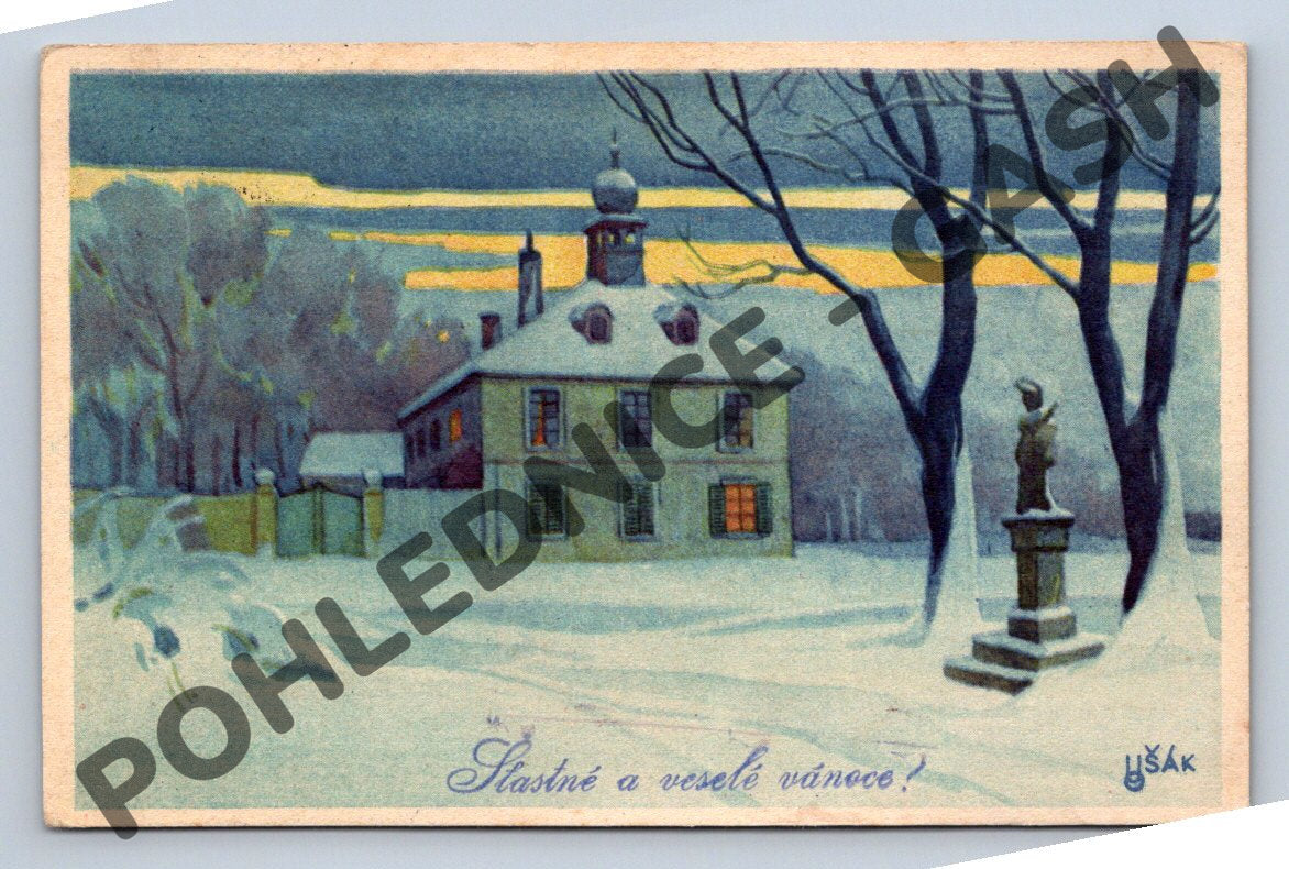 Starší česká pohlednice s motivem zimní krajiny – zasněžený dvůr se sochou a budovou, s nápisem Šťastné a veselé vánoce!. Autorem pohlednice je B. ŠÁK. Pohlednice je použitá, s ručně psaným textem a poštovním razítkem z období první poloviny 20. století. Na zadní straně adresní pole, známka chybí. Formát menšího rozměru do roku 1950. Sbírkový stav – stáří a patina podle fotografie, okraje lehce zaoblené, jinak bez zjevného poškození. Skvělý doplněk do sbírky historických vánočních pohlednic z ČR.