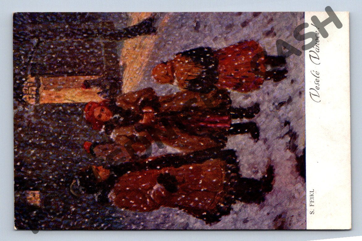 Originální historická pohlednice z období první světové války s vánočním motivem. Na přední straně ilustrovaná sněhová scéna s dětmi, signováno S. Feikl. Text Veselé Vánoce!. Zadní strana pohlednice obsahuje ručně psané věnování z roku 1915 – krásný doklad doby vhodný pro sběratele. Pohlednice má drobné známky stáří, zachovalý stav odpovídající stáří více než 100 let. Vhodná do sbírky starých českých vánočních pohlednic. Formát malý, neprošlá poštou.