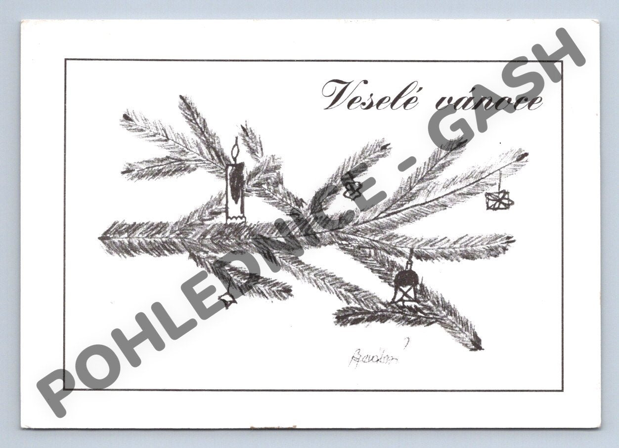 Originální česká vánoční pohlednice s motivem větvičky jehličnanu, na které jsou zavěšeny tradiční ozdoby a svíčka. Pohlednice je opatřena nápisem Veselé vánoce. Jedná se o unikátní kousek, jehož originál byl doma malován a zabalen postiženým člověkem. Zadní strana je neprošlá, čistá a připravená k odeslání. Rozměr odpovídá velkému formátu pohlednic vydávaných po roce 1950. Vydání: Polid s.r.o. Pohlednice je zajímavým dokladem českých svátečních tradic a potěší každého sběratele či milovníka Vánoc.