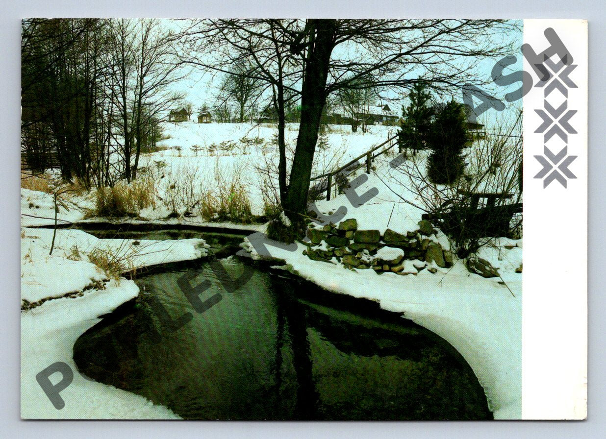 Nabízím originální pohlednici s motivem zimní krajiny v Česku. Na přední straně pohlednice je barevná fotografie zasněžené přírody s potokem a stromy. V pozadí jsou vidět venkovské stavby a krajina zahalená sněhem. Pohlednice je použita, na zadní straně je krátký ručně psaný vzkaz a známka ČSSR. Datace dle motivu a razítka odpovídá období před rokem 1950. Výborný sběratelský stav, vhodné pro sběratele historických pohlednic či zájemce o zimní a venkovské motivy.