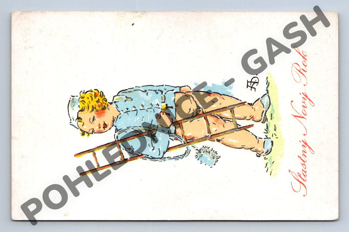 Starší česká novoroční pohlednice s originální ilustrací dítěte nesoucího žebřík. Na přední straně je ručně psaný nápis Šťastný Nový Rok a ilustrace je jemně kolorovaná, což naznačuje její stáří. Pohlednice je ve velmi dobrém sběratelském stavu, čistá, bez textu či adresy na zadní straně. Vhodné pro sběratele historických pohlednic nebo jako milý dárek k novému roku s retro nádechem. Formát malý, pochází pravděpodobně z první poloviny 20. století.