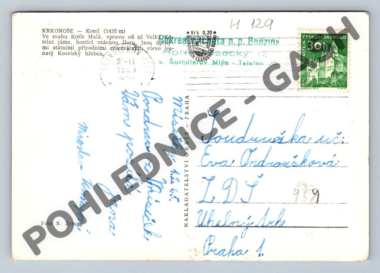 Pohlednice zachycuje zimní krajinu Krkonoš s vrcholem Kotel (1435 m) pokrytým sněhem a zasněženými stromy v popředí. Černobílá fotografie působí malebně a dokumentuje typickou atmosféru českých hor. Na zadní straně je rukopisné věnování, poštovní známka ČSR a razítko odeslání. Vhodná pro sběratele historických pohlednic, milovníky Krkonoš nebo nostalgické upomínky na českou krajinu.