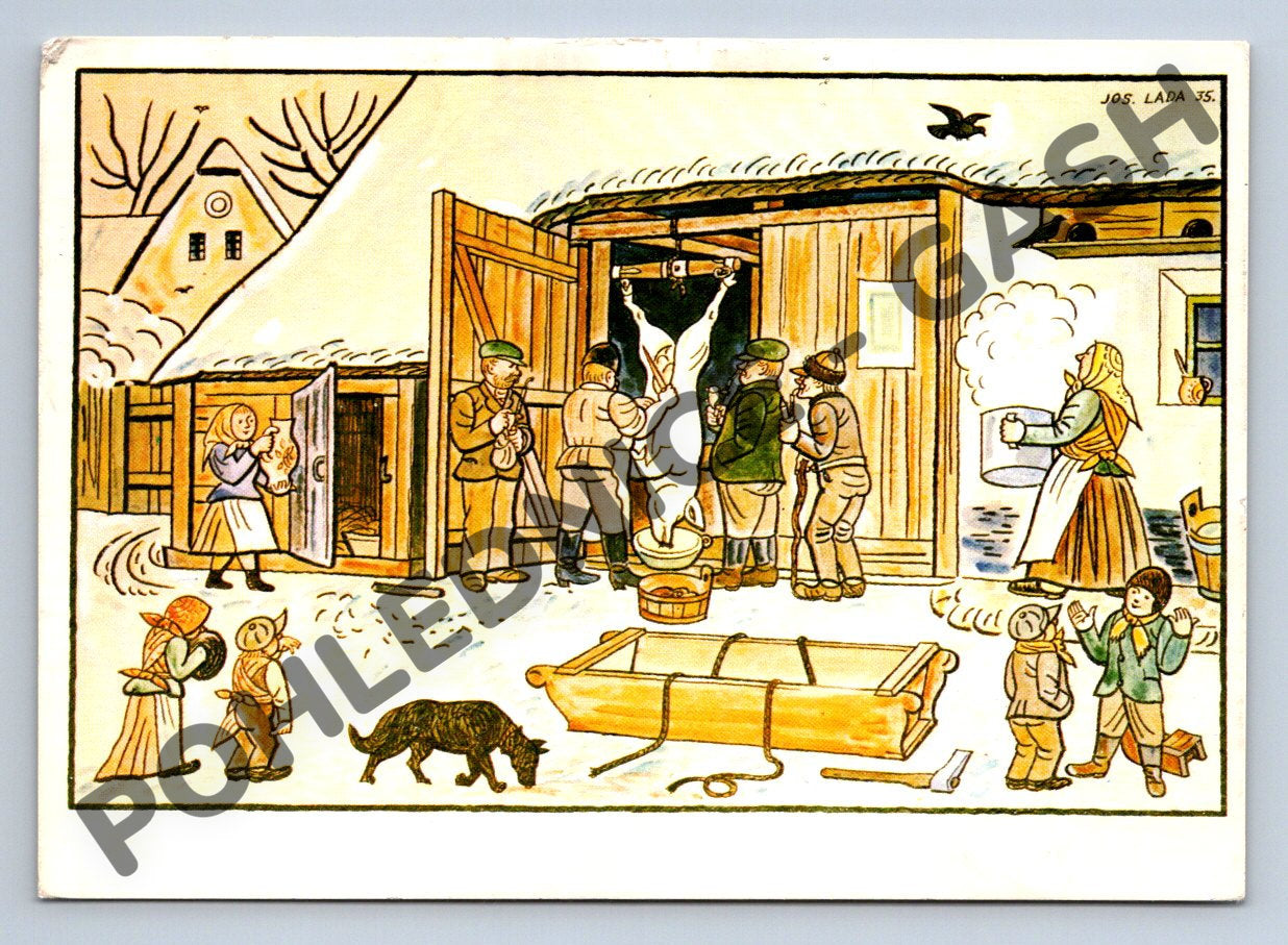 Originální pohlednice s barevnou kresbou Josefa Lady z roku 1935, vydaná tiskem Severografia Děčín. Pohlednice zobrazuje tradiční českou zimní vesnickou scenérii s lidmi, kteří se připravují na Vánoce – na obrázku jsou zobrazeni dospělí i děti, domácí zvířata a charakteristické stavení. Pohlednice byla odeslána v prosinci 1984, je opatřena československou známkou v hodnotě 50 haléřů a ručně psaným pozdravem s novoročním přáním. Celkový stav pohlednice odpovídá stáří, rohy jsou mírně opotřebované, bez vážného poškození. Sbírkový kousek pro milovníky českého malířství a ilustrací Josefa Lady.