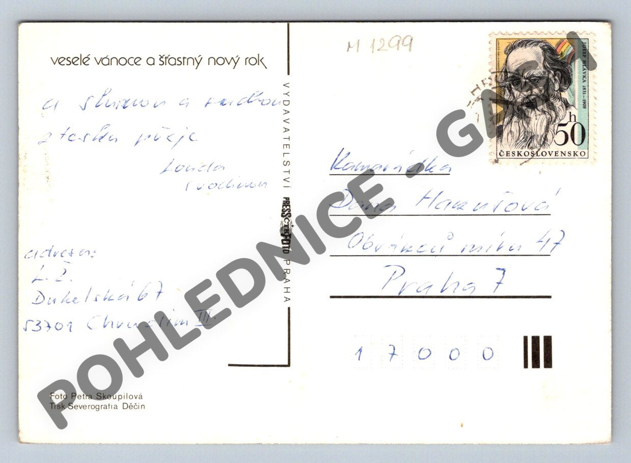 Originální československá pohlednice s vánočním motivem, zobrazující zasněženou ozdobu na větvi jehličnanu a červenou stuhou. Zadní strana je vyplněna ručně psaným přáním Veselé Vánoce a šťastný nový rok a adresou adresáta. Pohlednice je opatřena známkou s portrétem a razítkem. Jedná se o sběratelský kousek s osobním poselstvím z období ČSSR. Tisk Severografia Děčín, foto Petra Skoupilová. Výborný sběratelský stav, drobné známky stáří a poštovního oběhu.
