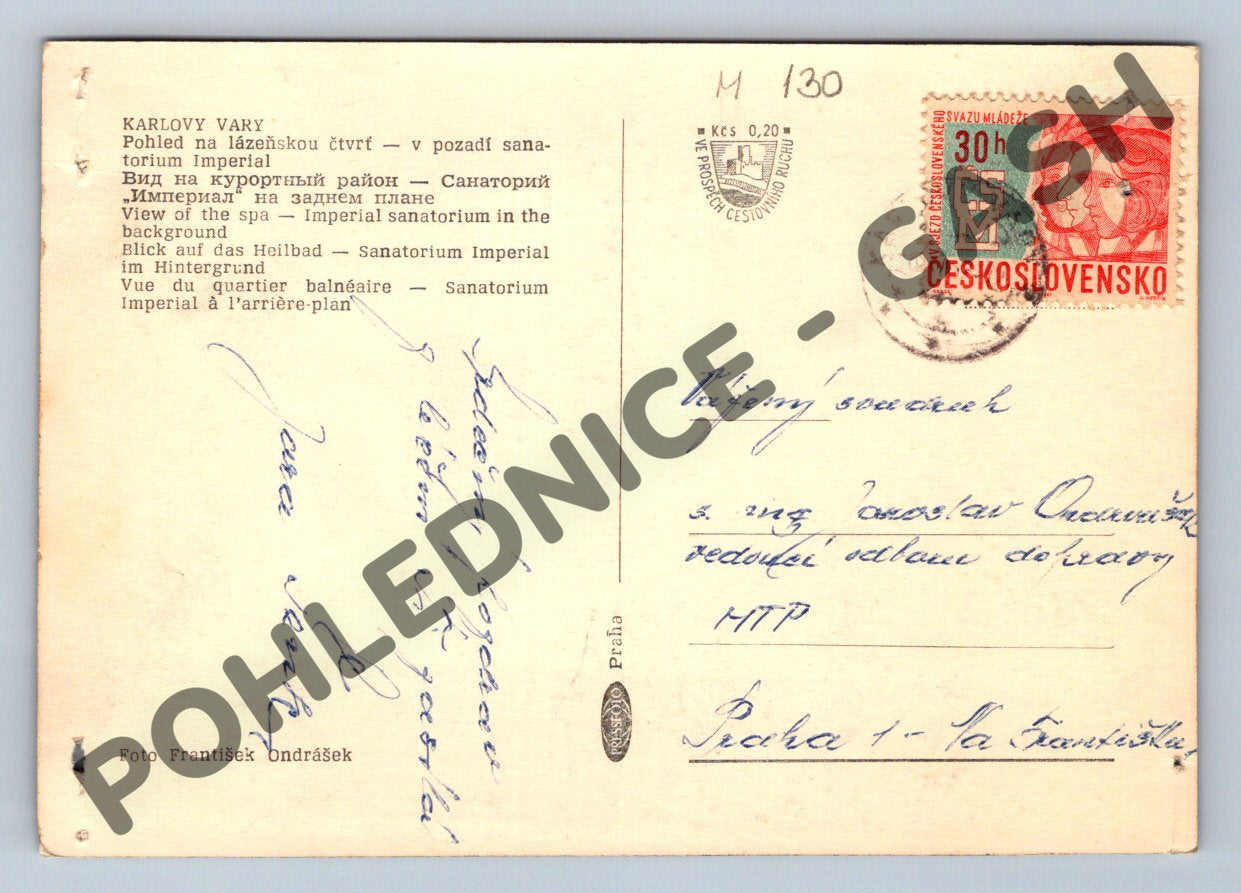 Originální černobílá pohlednice s leteckým pohledem na lázeňskou čtvrť Karlových Varů, v pozadí dominantní sanatorium Imperial. Na zadní straně stručný popis v několika jazycích, známka 30h a rukou psaný vzkaz. Fotografie František Ondrášek. Pohlednice je ve slušném sběratelském stavu, s místy mírným poškozením rohů a menším natržením. Autentický dobový dokument.